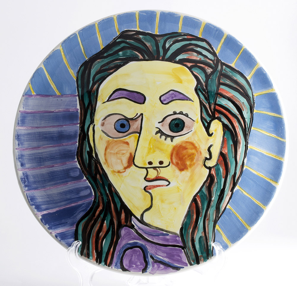 PABLO PICASSO Málaga 1881 – Mougins 1973 Volto maschile, 1953 Piatto in ceramica policroma, d 34 cm Firma, data e marchio al retro: Picasso 10.3.53 Madoura Plein Feu Empreinte Originale de Picasso PABLO PICASSO Málaga 1881 – Mougins 1973 Male face, 1953 Polychrome ceramic plate, d 34 cm Signed, dated and inscrbed on the back: Picasso 10.3.53 Madoura Plein Feu Empreinte Originale de Picasso