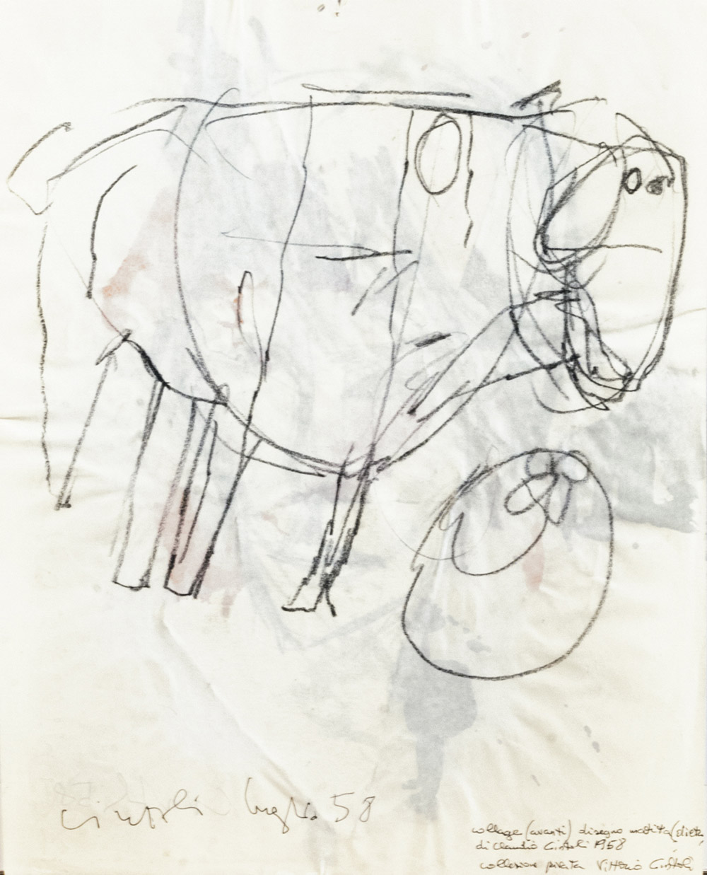 CLAUDIO CINTOLI Imola 1935 - Roma 1978 Senza titolo / Pecore, 1958 Collage/matita, 28,5 x 22,5 cm Firma e data in basso a destra: Cintoli 1958 Firma, data e autentica del figlio dell’Artista al retro Provenienza Già Collezione Vittorio Cintoli CLAUDIO CINTOLI Imola 1935 - Rome 1978 Untitled / Sheeps, 1958 Collage/pencil, 28,5 x 22,5 cm Signed and dated lower right: Cintoli 1958 Signed, dated and certificate of authenticity by the Artist’s son on the back Provenance Vittorio Cintoli Collection