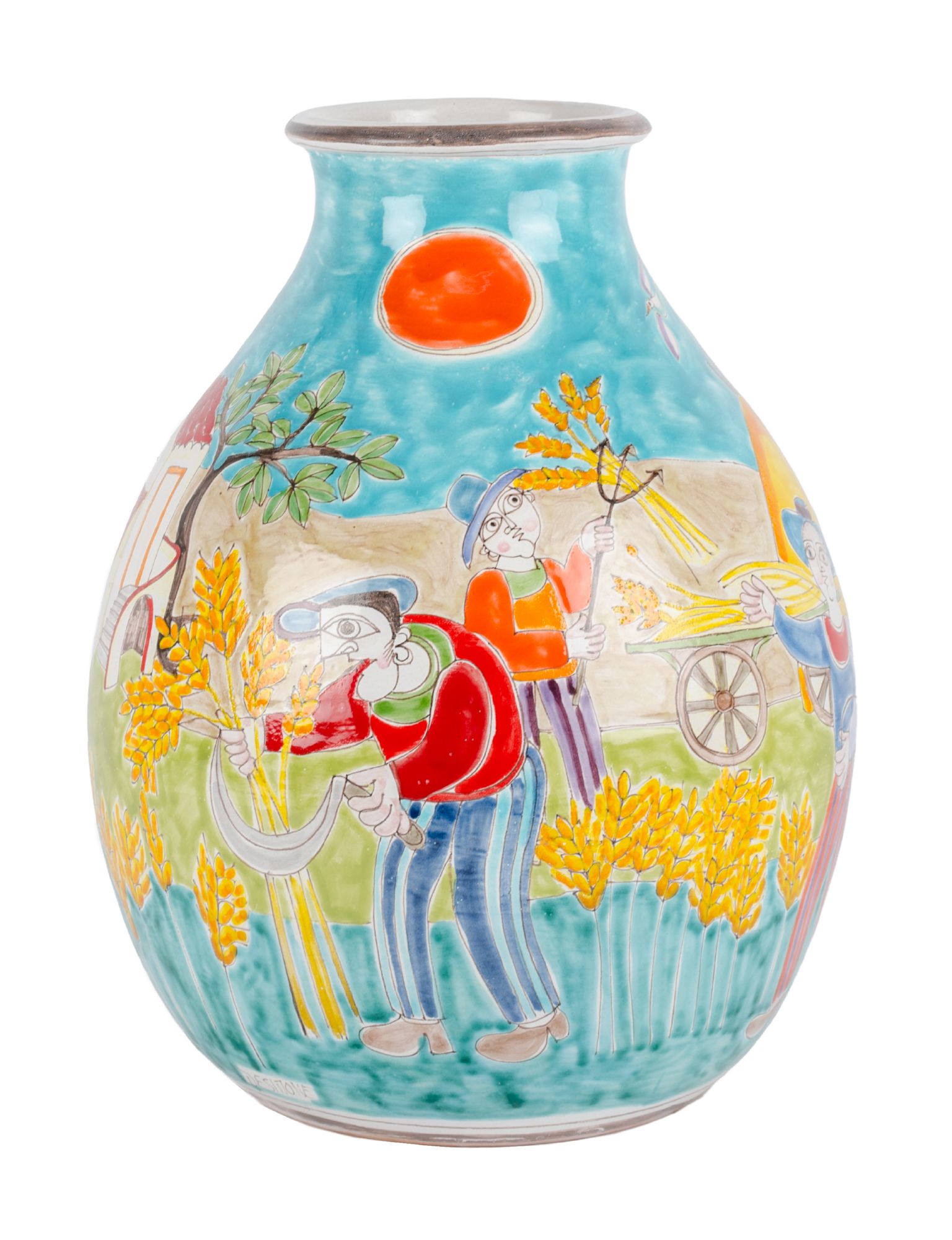 DE SIMONE VASO in ceramica dipinta raffigurante "paesaggio con contadini". XX secolo Misure: h cm 43