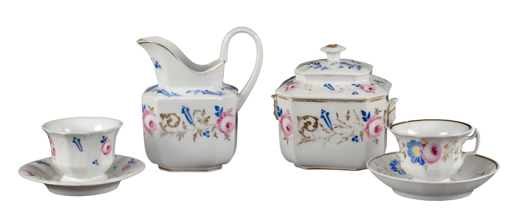 PARTE di SERVIZIO Luigi Filippo in porcellana decorata composto da LATTIERA, ZUCCHERIERA e da due TAZZE con piattino (difetti). XIX secolo Misure: varie