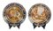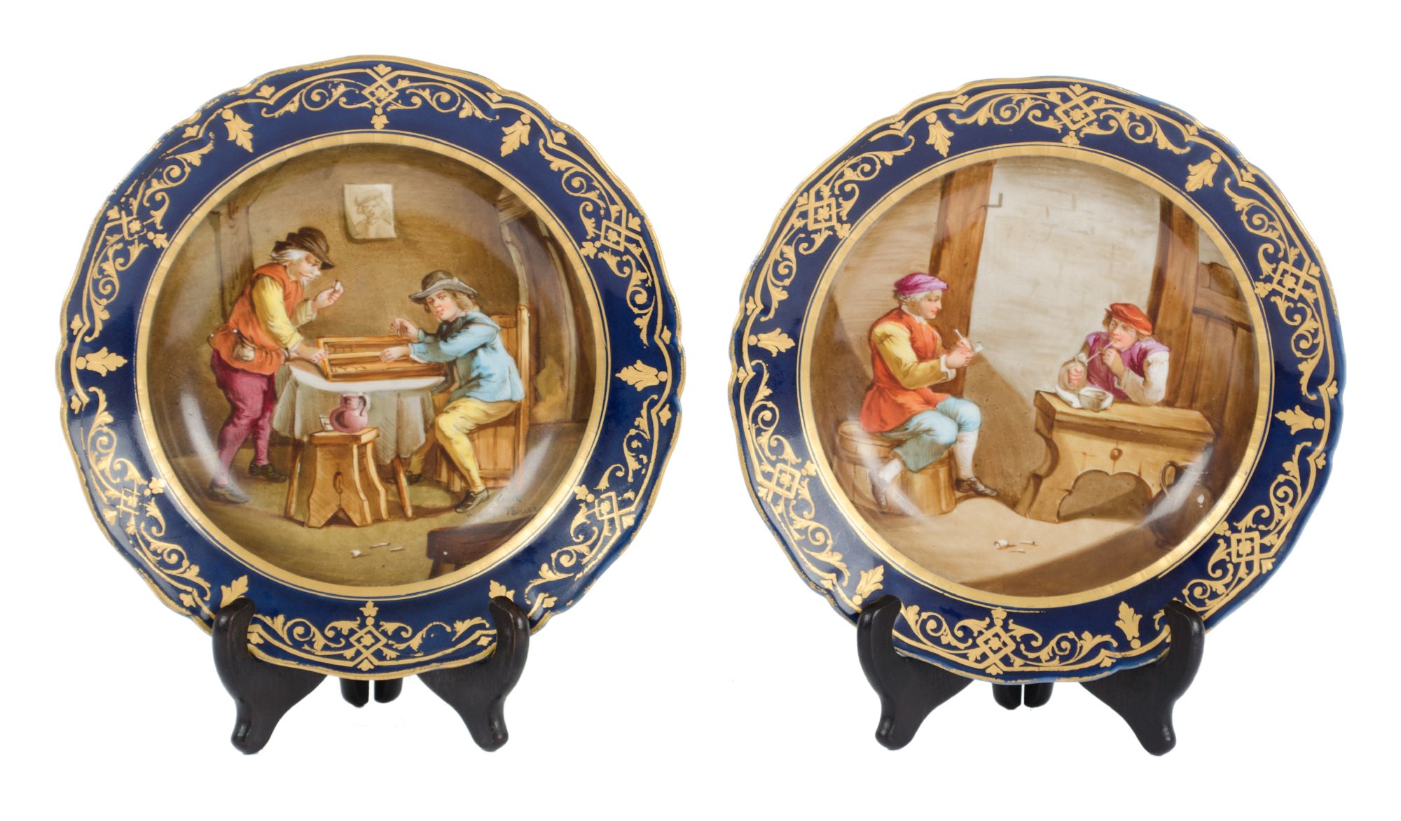 COPPIA PIATTI in porcellana di Sevres blu cobalto con lumeggiature in oro e fondo dipinto raffigurante "interno di locande con personaggi". Francia XIX secolo Misure: diametro cm 23,5