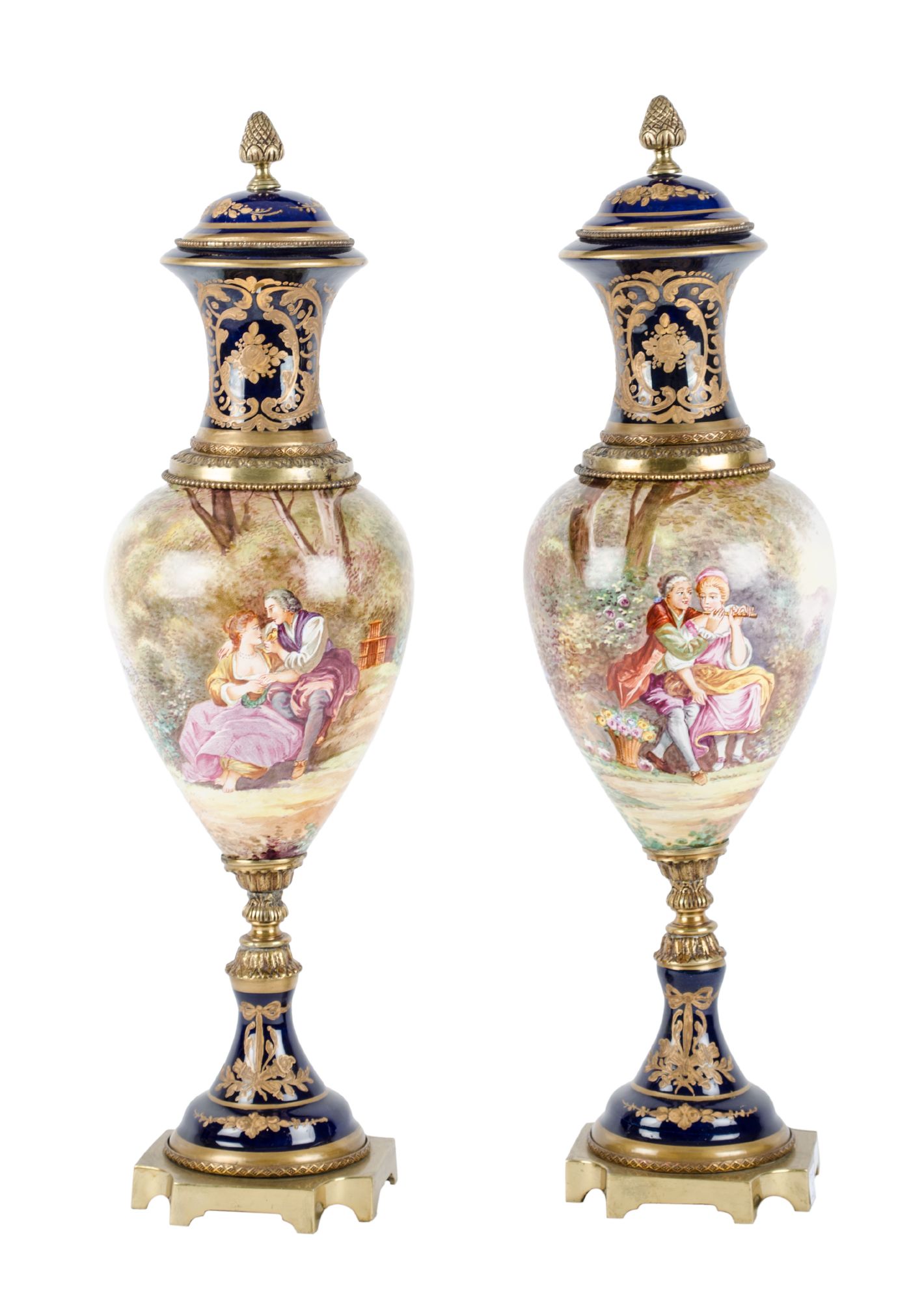 COPPIA POTICHE in porcellana di Sevres dipinta raffigurante "paesaggio con scena galante" firmati L. Richet. Francia XX secolo Misure: h cm 57