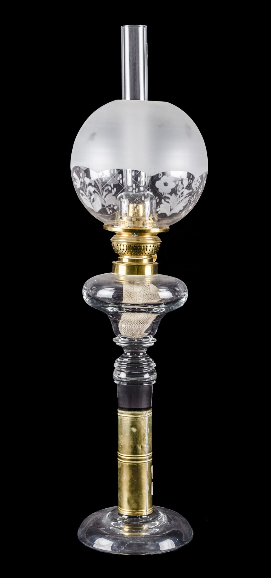 LUME a petrolio in vetro con fusto e collo rivestiti in ottone, tubo e boccia in vetro lavorato. XX secolo Misure: diametro cm 15 x h 67