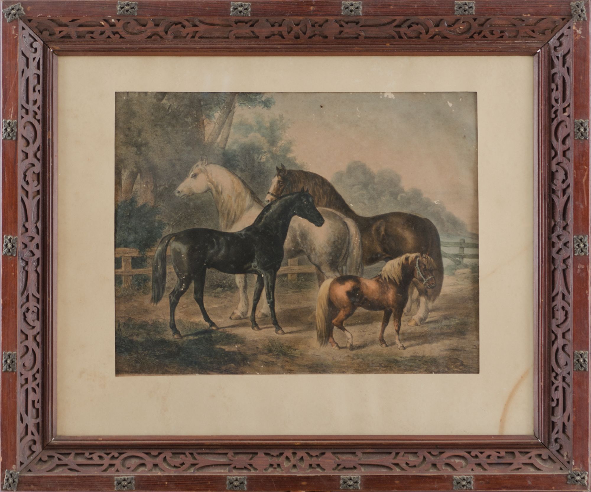 STAMPA a colori "paesaggio con cavalli" entro cornice in palissandro. Spagna periodo Liberty primi '900 Misure: cm 44 x 56