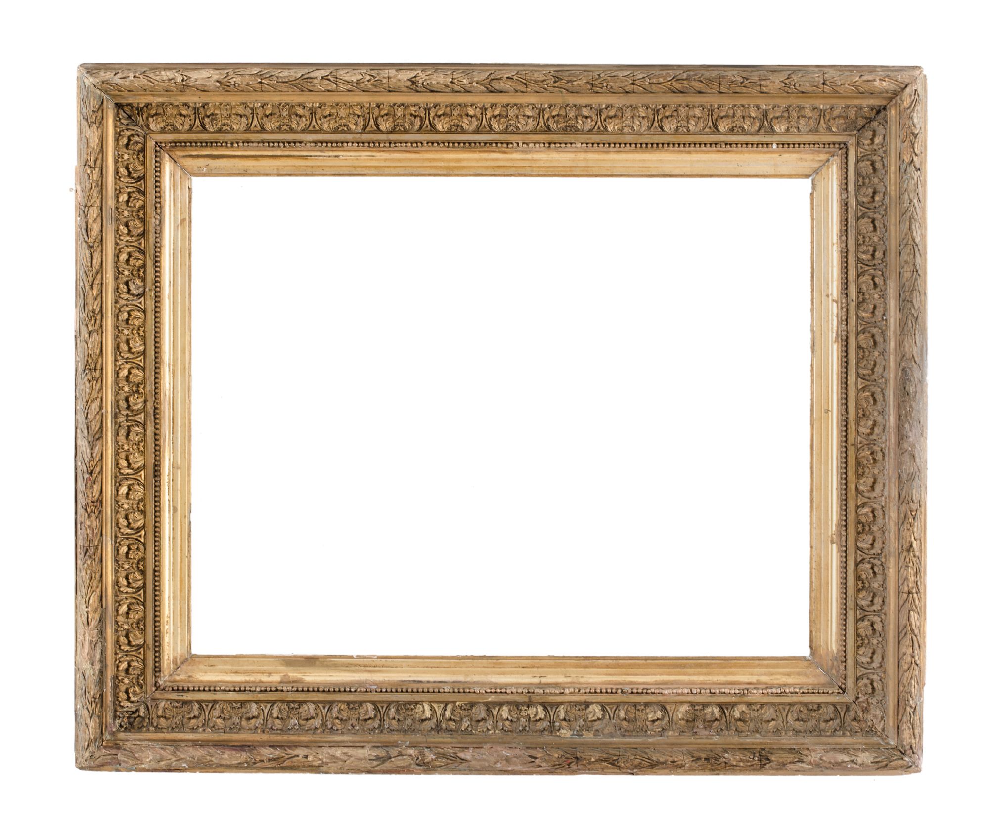 CORNICE in legno e pastiglia dorata (cm 50 x 65). Francia XIX secolo Misure: cm 74 x 89