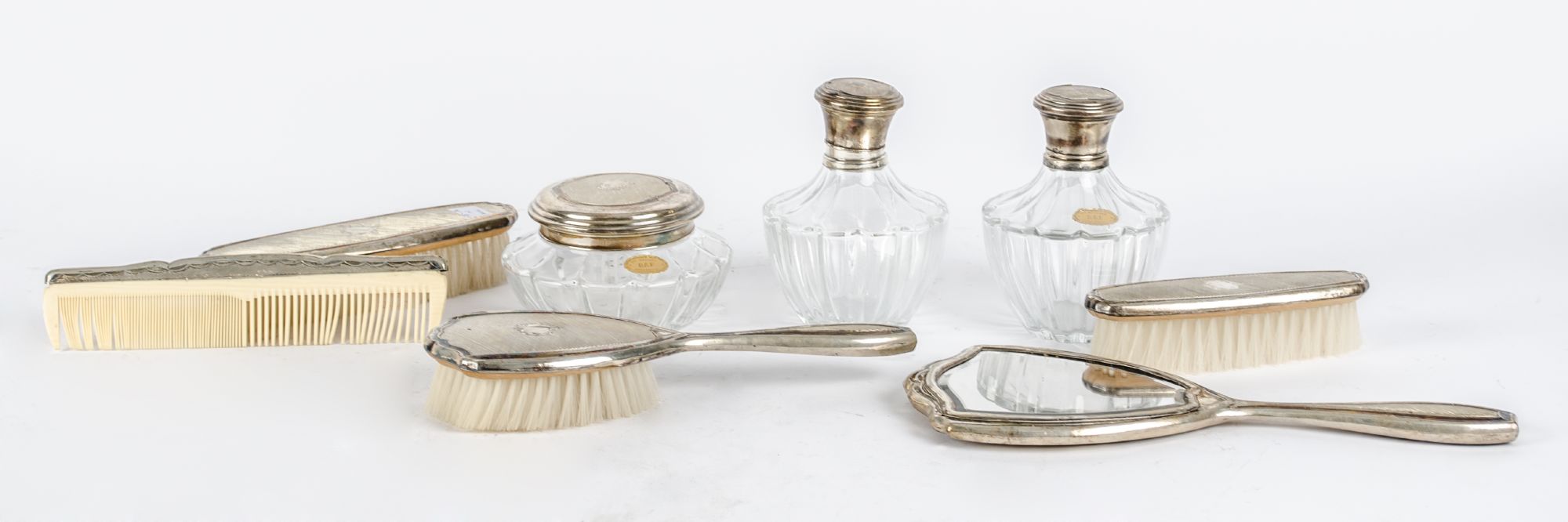 SET DA TOLETTA rivestito in argento composto da 2 BOTTIGLIE porta profumo, PORTATALCO, SPECCHIO, PETTINE e da 3 SPAZZOLE. Primi '900 Misure: varie