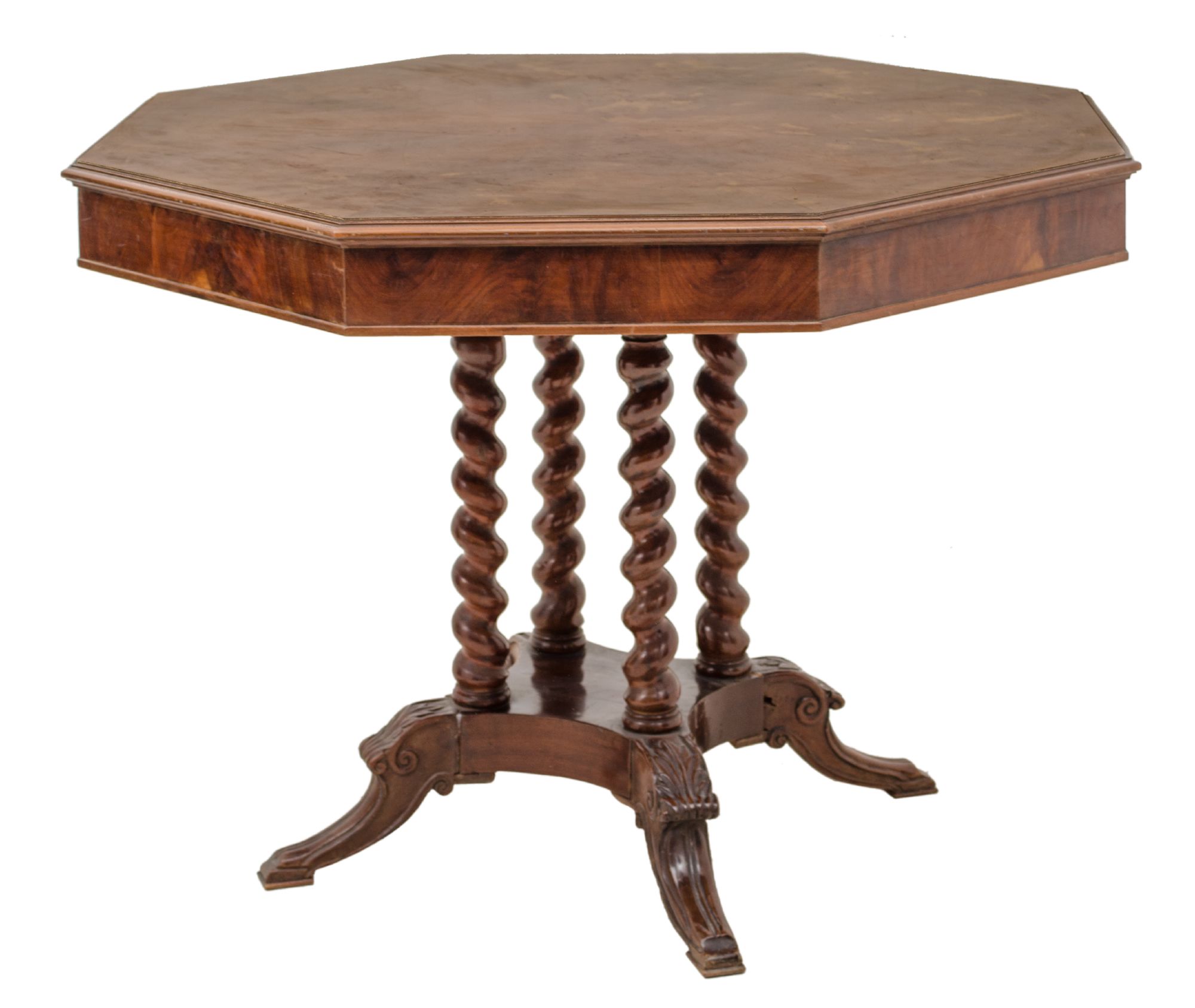 TAVOLO da centro in mogano e piuma di mogano, gambe a torciglione. Sicilia...