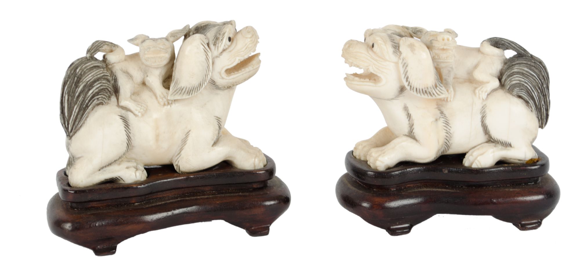 COPPIA SCULTURE in avorio raffiguranti "cani di Pho", basi in legno. Cina primi '900 Misure: h cm 7