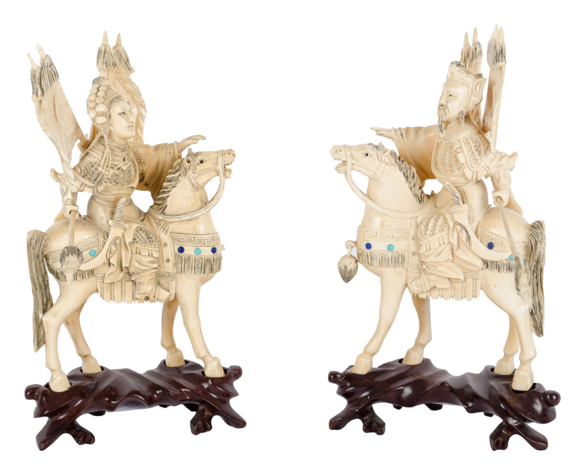 COPPIA SCULTURE in avorio raffiguranti "figure nobiliari a cavallo" con innesti di cabochion di turchesi e lapis, base in legno. Cina meta' '900 Misure: h cm 18