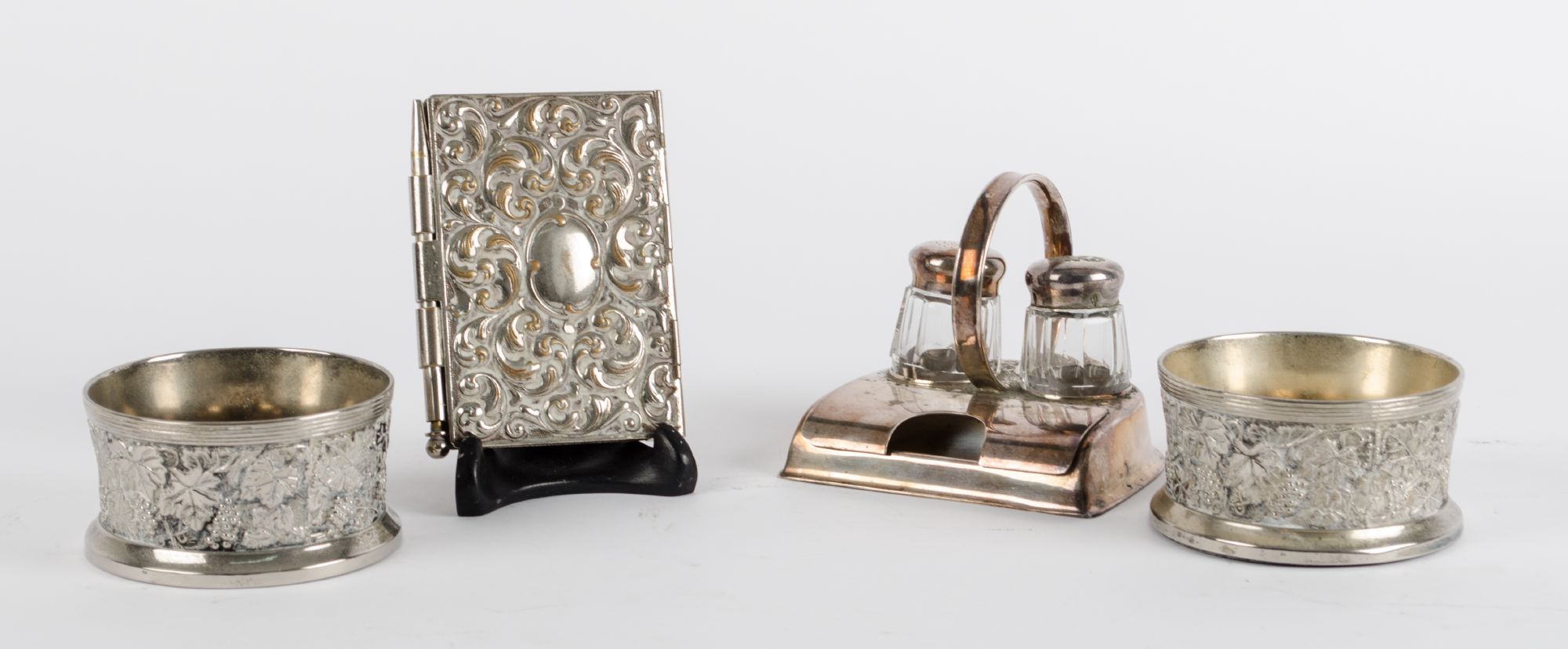 LOTTO composto da MENAGE in Sheffield e vetro, PORTA AGENDA e da due SOTTO BOTTIGLIE in Sheffield. XX secolo Misure: varie