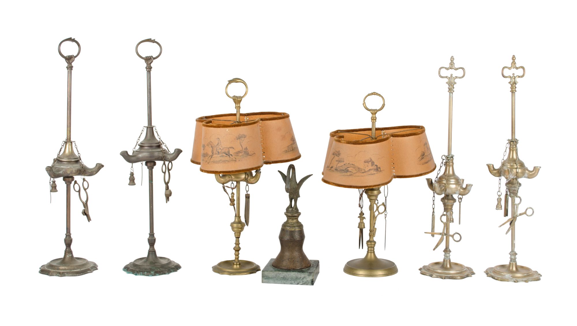 LOTTO composto da sei LUCERNE in metallo e da SCULTURA in metallo...