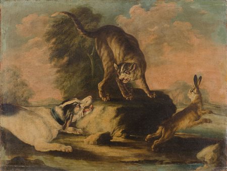 OLIO su tela "scena di caccia". Italia XVIII secolo Misure: cm 75 x 101