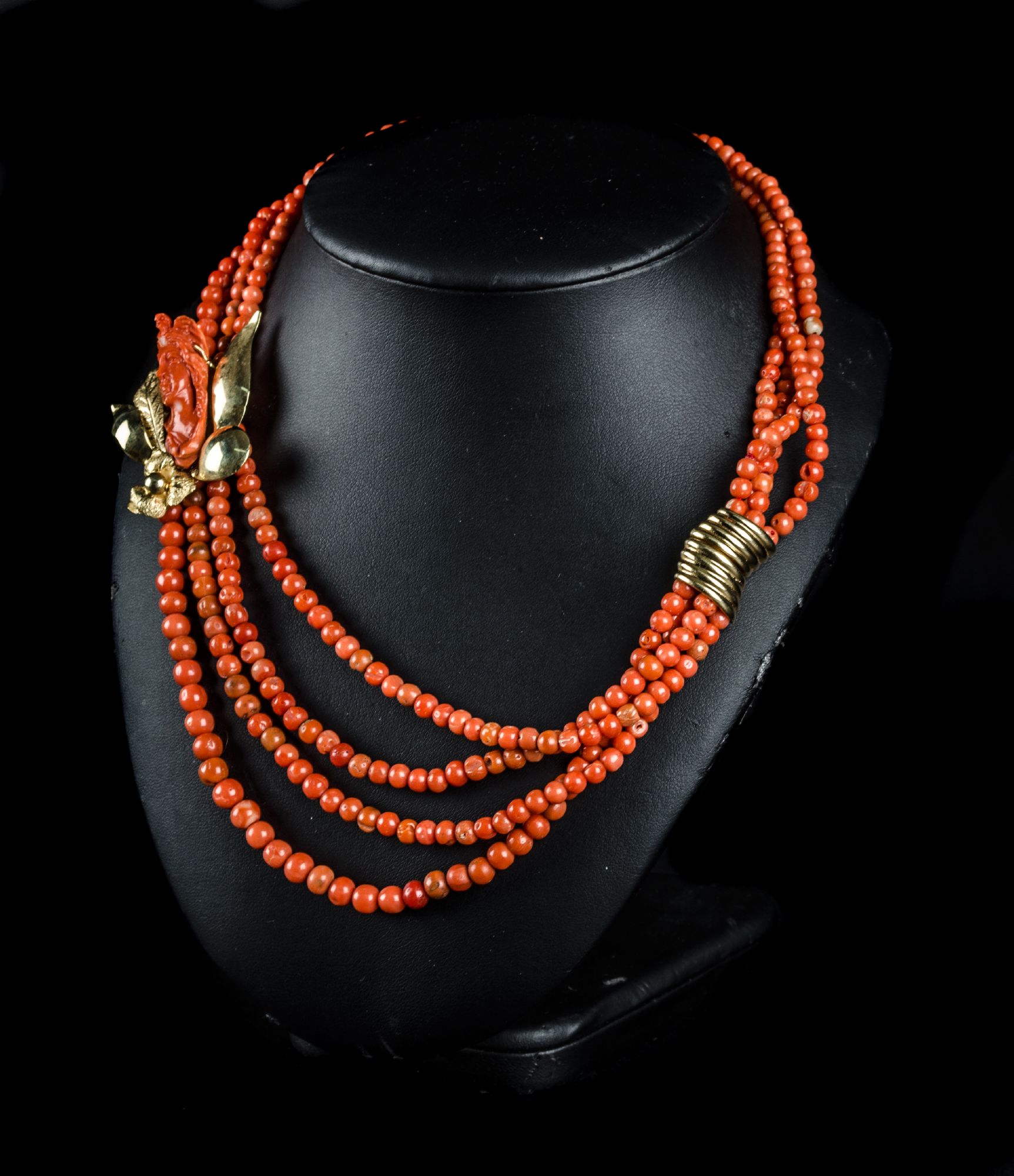 COLLANA in oro giallo 18 Kt. con 4 fili di corallo e scultura raffigurante "mezzo busto femminile" con susta in oro giallo 18 Kt. (g. 80).