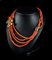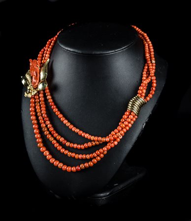 COLLANA in oro giallo 18 Kt. con 4 fili di corallo e scultura raffigurante...