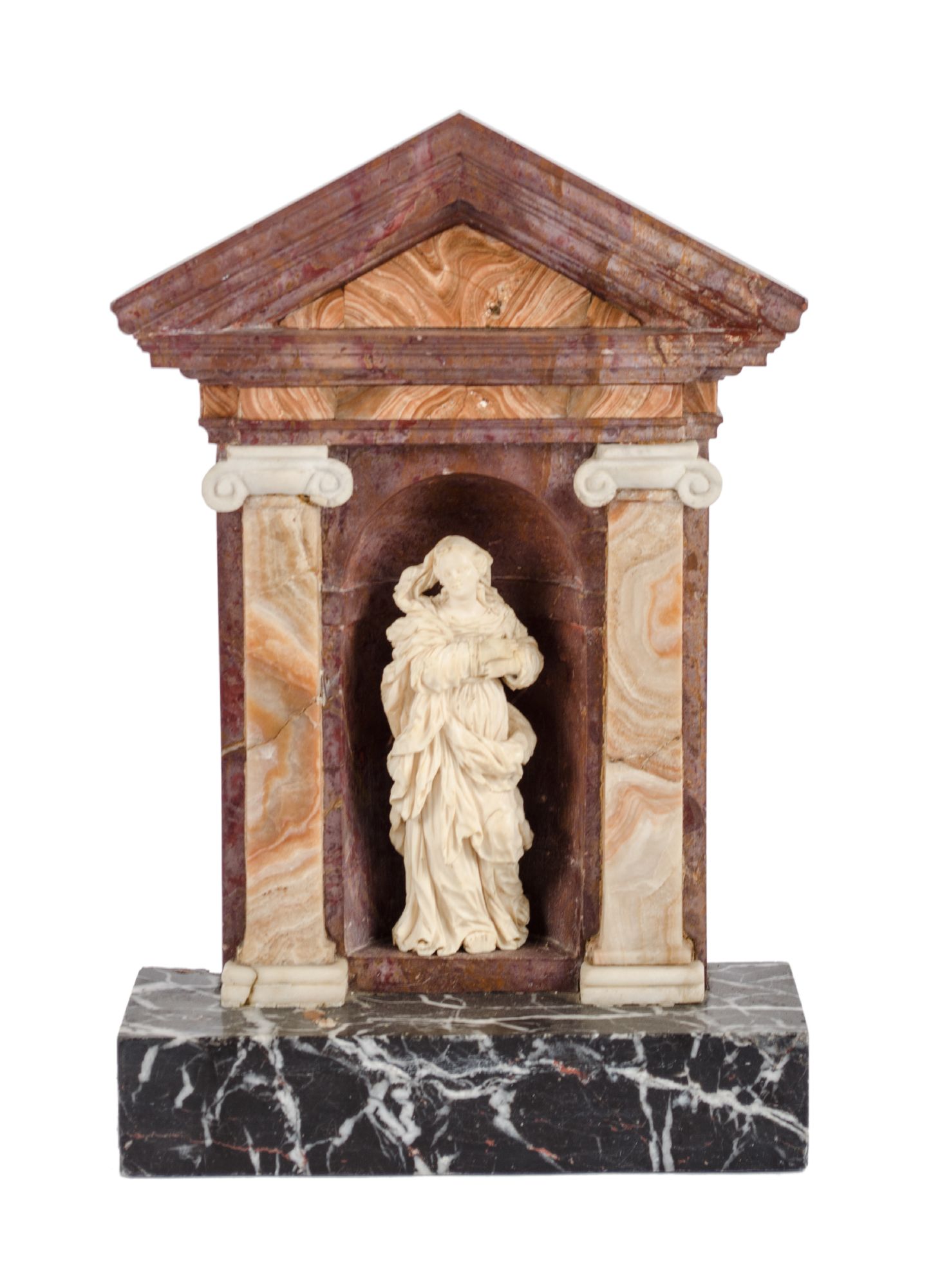 SCULTURA in avorio raffigurante "Madonna" entro tempietto in marmo del XIX secolo. Sicilia XVIII secolo Misue: h cm 32