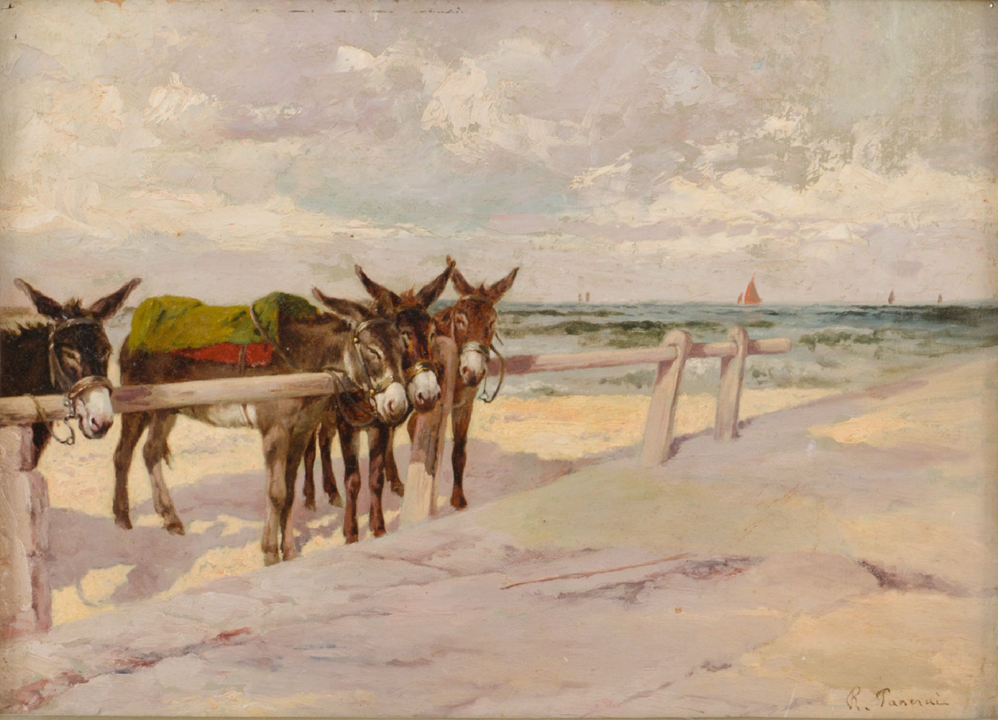 RUGGERO PANERAI (Firenze 1862 - Parigi 1923) OLIO su cartone "asinelli in riva al mare", firmato in basso a destra. Misure: cm 26 x 36
