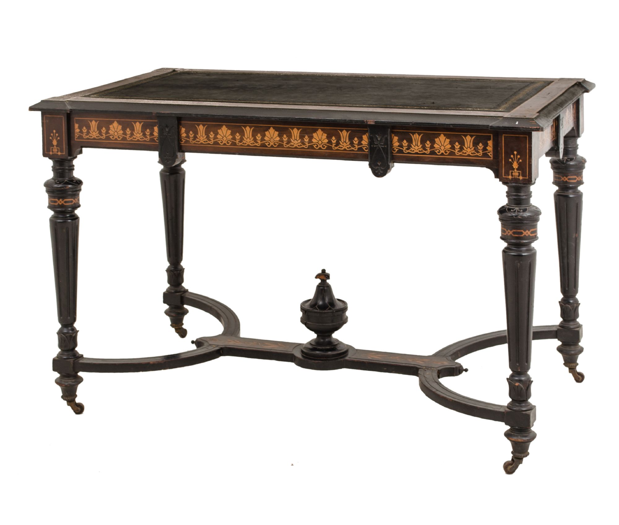 SCRITTOIO in legno ebanizzato e radica di tuja con tarsie in bosso, piano in pelle con bordure dorate. Inghilterra XIX secolo Misure: cm 122 x 70 x h 79
