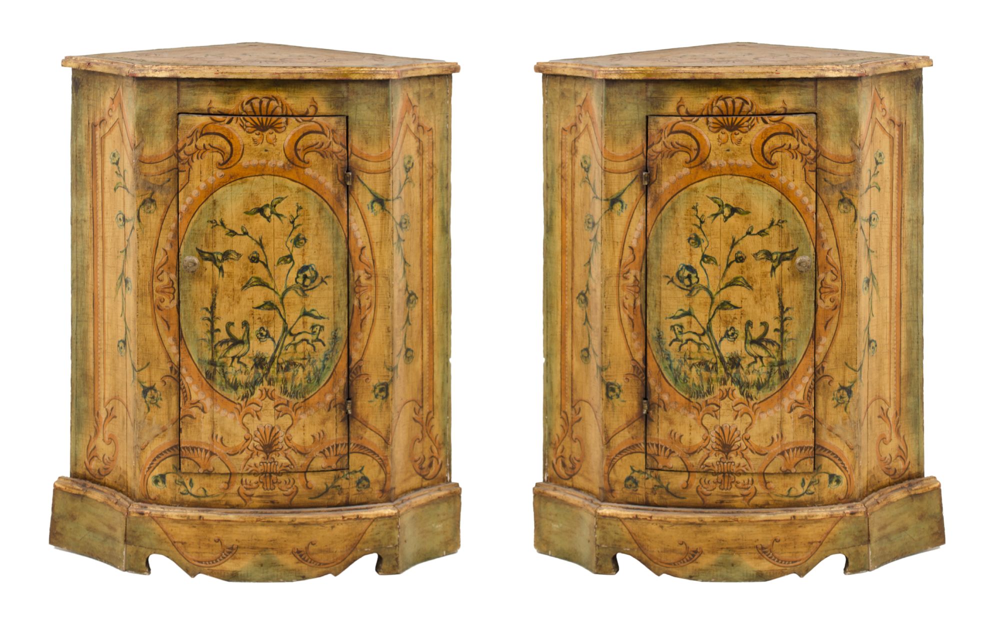 COPPIA ANGOLIERE ad un'anta in legno laccato e decorato. Italia XX secolo Misure: cm 73 x 52 x h 90,5