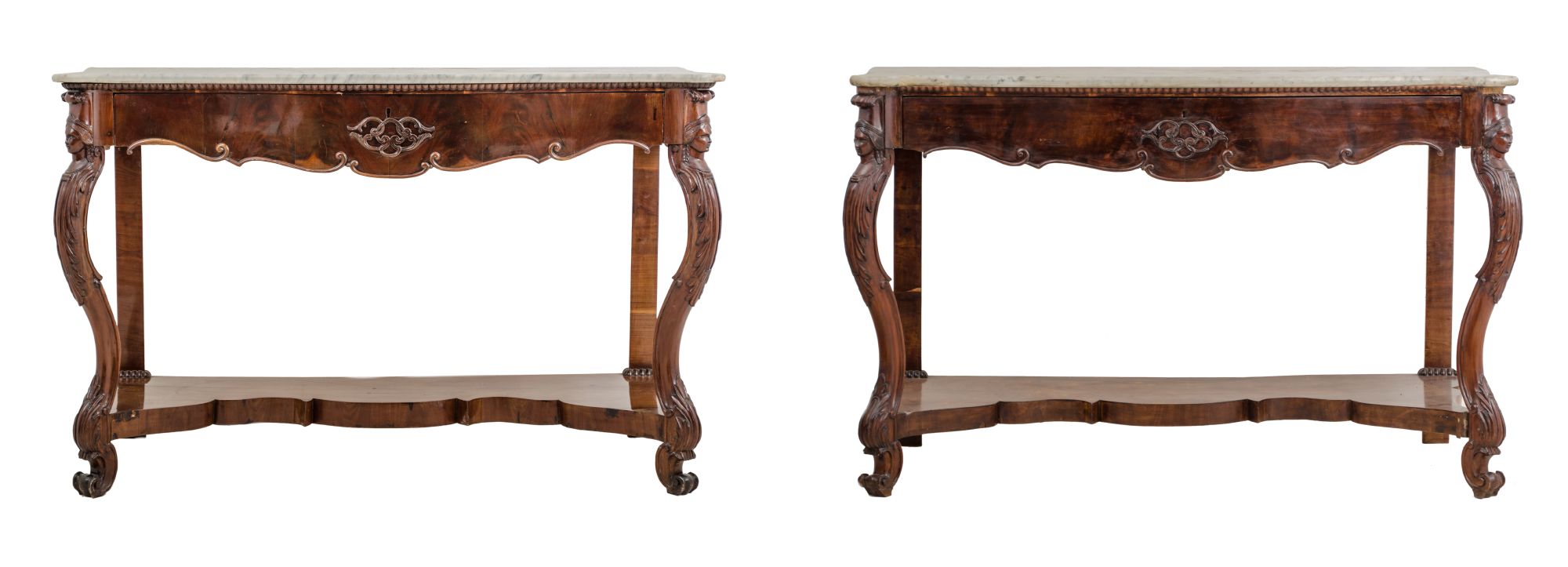 COPPIA CONSOLES Luigi Filippo in mogano e piuma di mogano con cassetto centrale e piano in marmo bianco di Carrara. Sicilia XIX secolo Misure: cm 160 x 61 x h 102