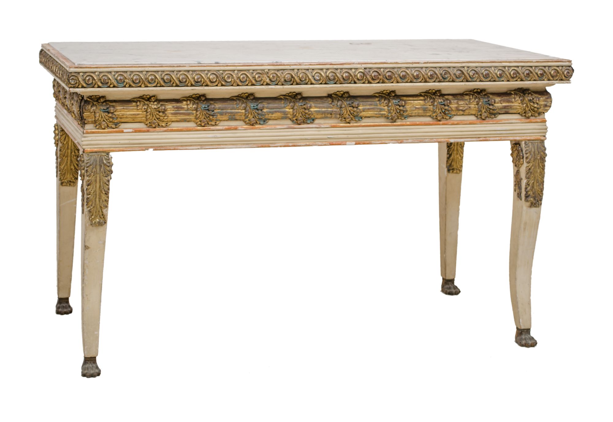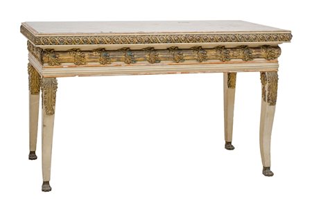 CONSOLE in legno laccato e dorato con piano in marmo bianco venato. Italia...
