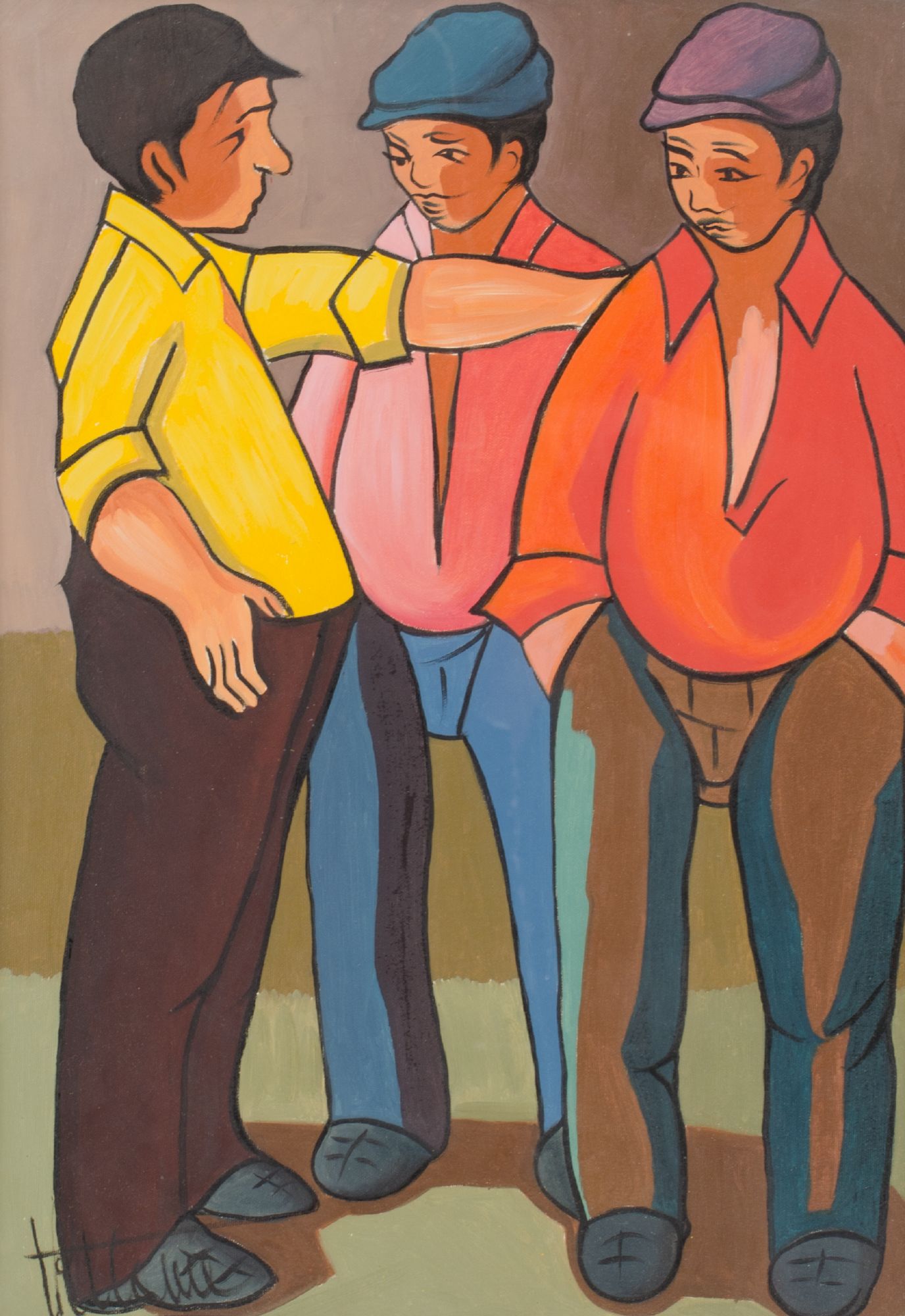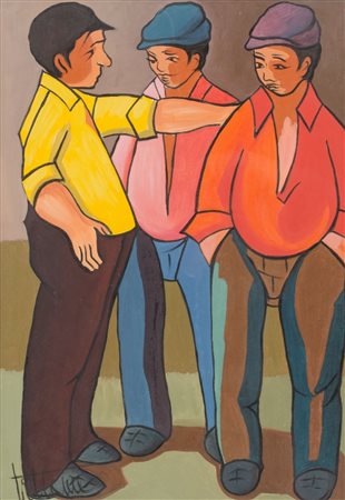 OLIO su tela "personaggi", firmato in basso a sinistra. XX secolo Misure: cm 70 x 50