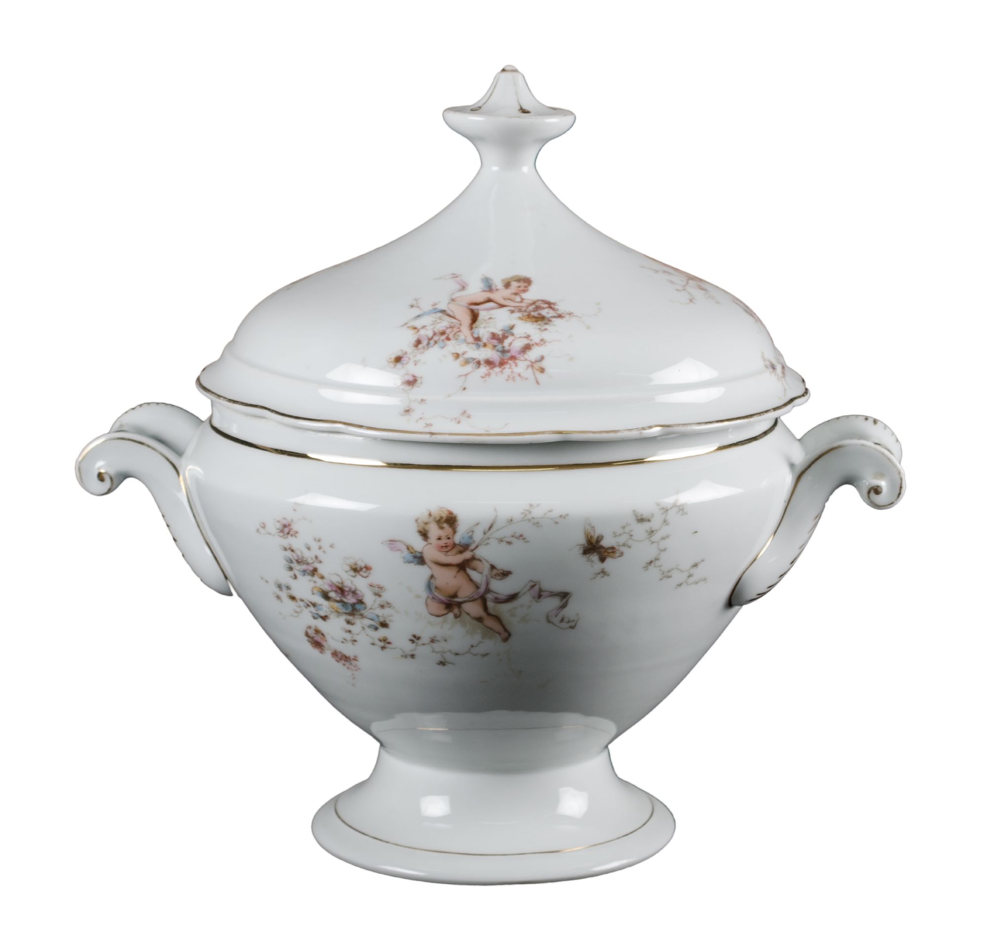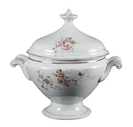 ZUPPIERA in ceramica Springer nei toni del bianco dipinta a mano raffigurante "puttini", lumeggiature in oro. Primi '900 Misure: cm 32 x 25 x h 33