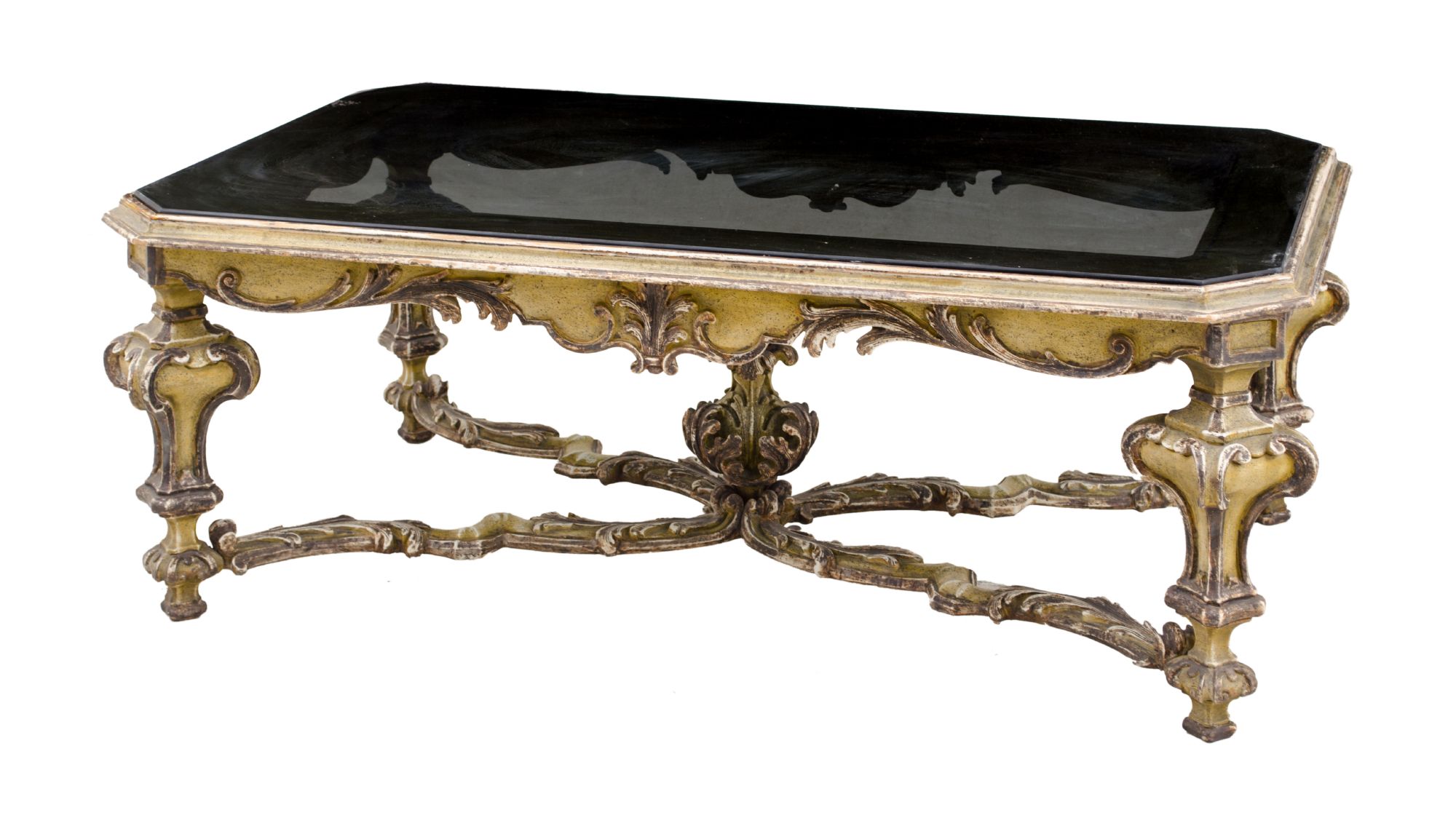 TAVOLINO da salotto stile Barocco in noce con piano in vetro. Firenze XX...