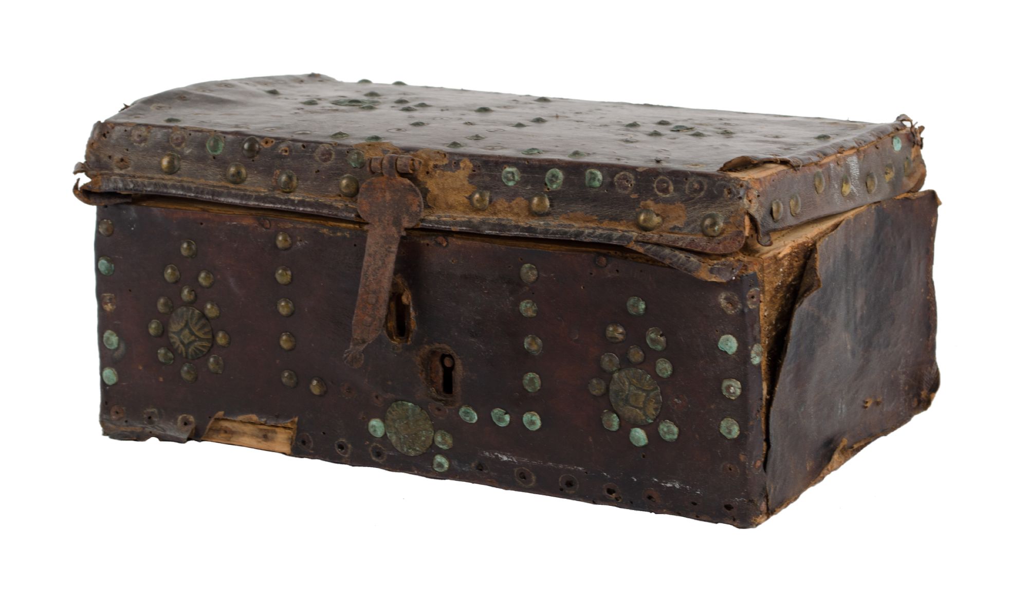 COFANETTO in legno rivestito in cuoio. Sicilia XVII secolo Misure: cm 36 x 21 x h 16