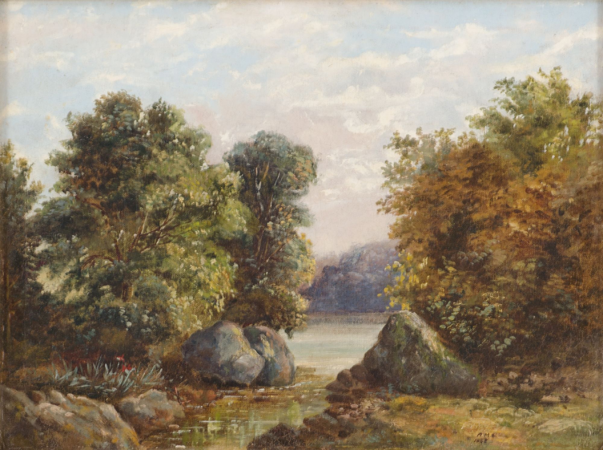 A.M. SLATER OLIO su tela "paesaggio boschivo con ruscello" monogrammato,...