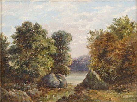A.M. SLATER OLIO su tela "paesaggio boschivo con ruscello" monogrammato, entro cornice in legno e pastiglia dorata. Datato 1885 Misure: cm 31 x 41