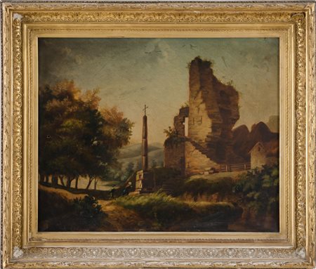 H. DELORME OLIO su tela "paesaggio con personaggi" firmato in basso a sinistra entro cornice in legno e pastiglia dorata (usure e difetti). Datato 1861 Misure: cm 46 x 55