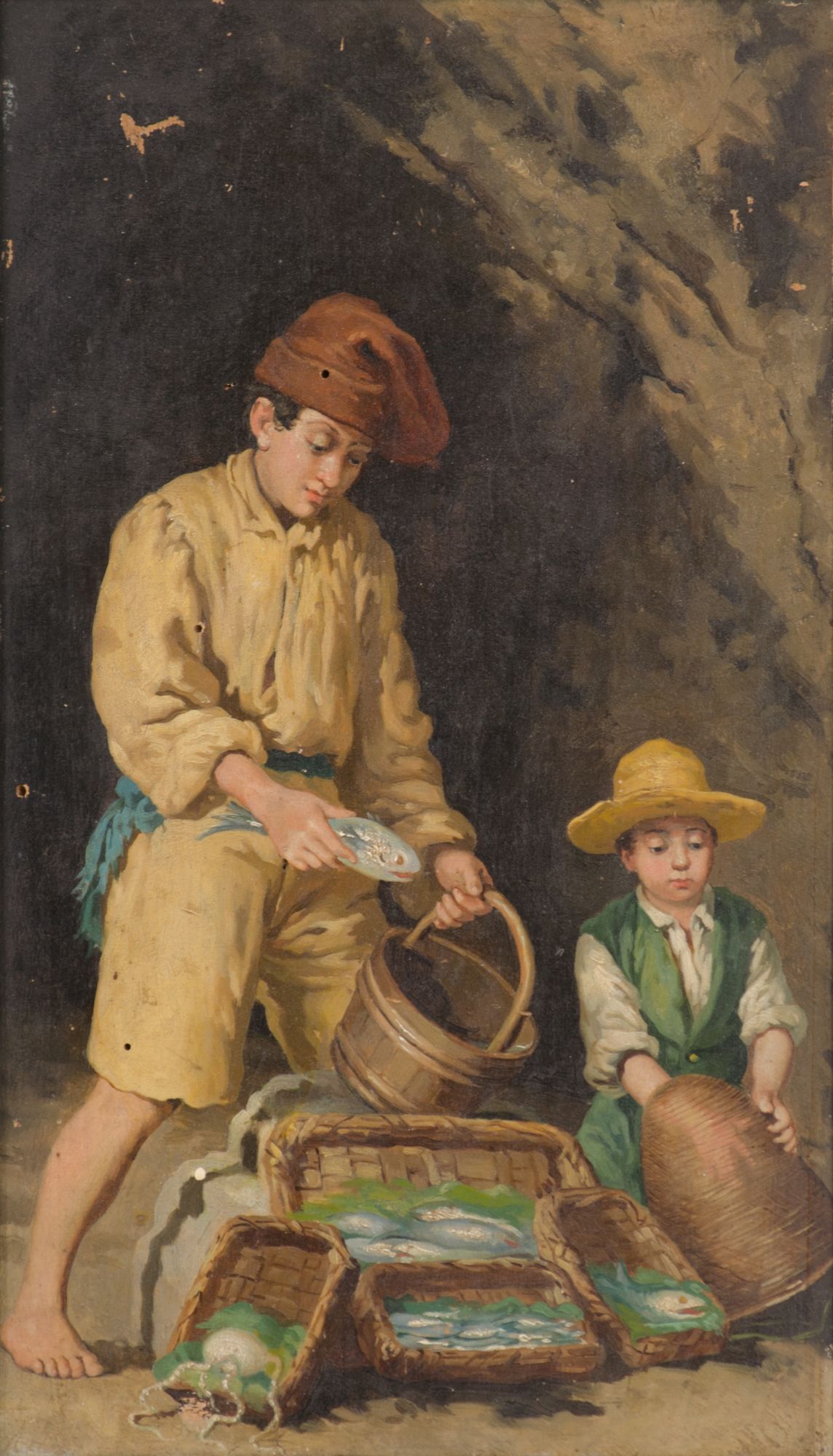 MICHELE RICCI OLIO su tavoletta "venditore di pesce", firmato sul retro. XIX secolo Misure: cm 31 x 18