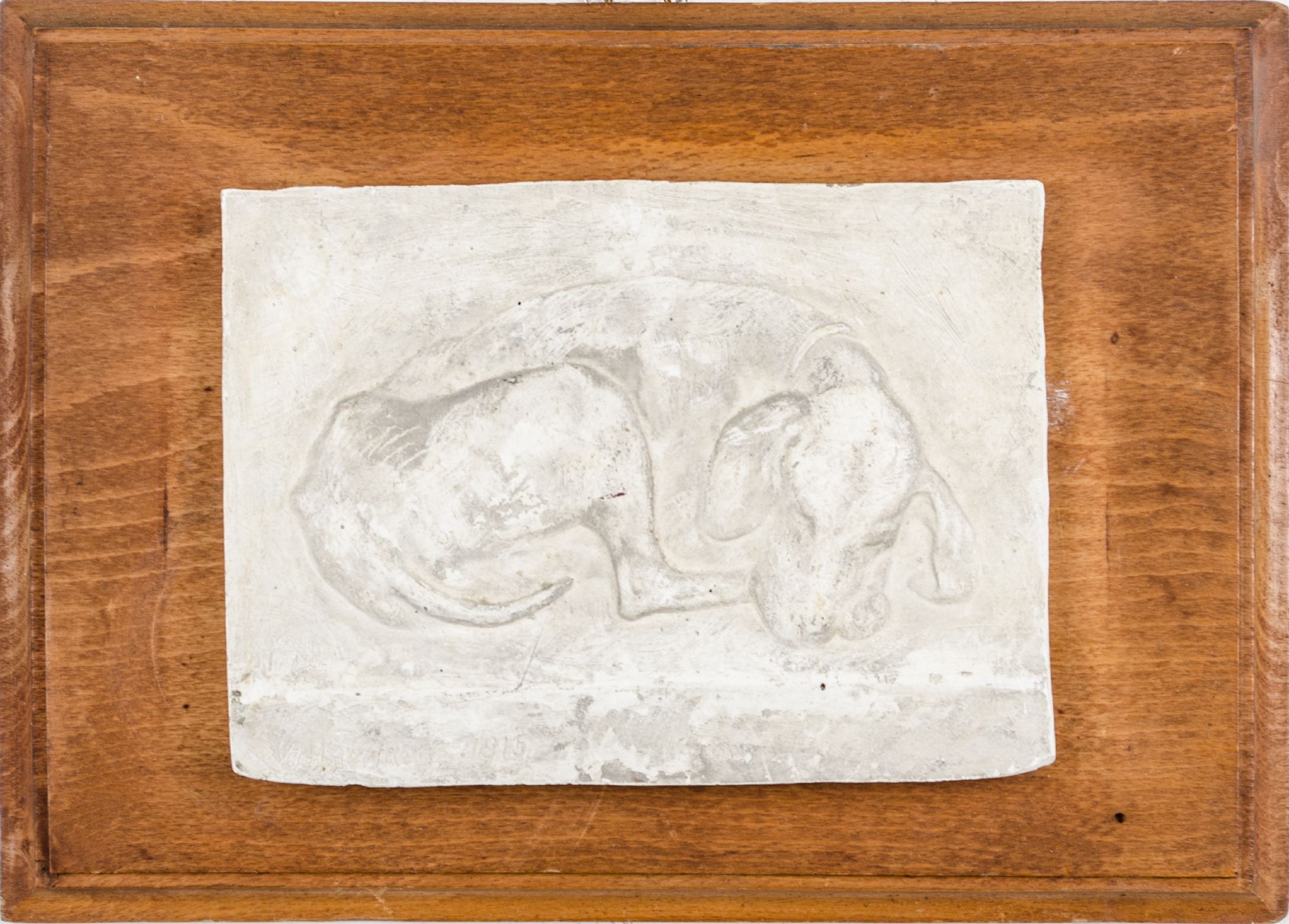 A. LAVARONE BASSORILIEVO in terracotta raffigurante "cane". Datato 1915...