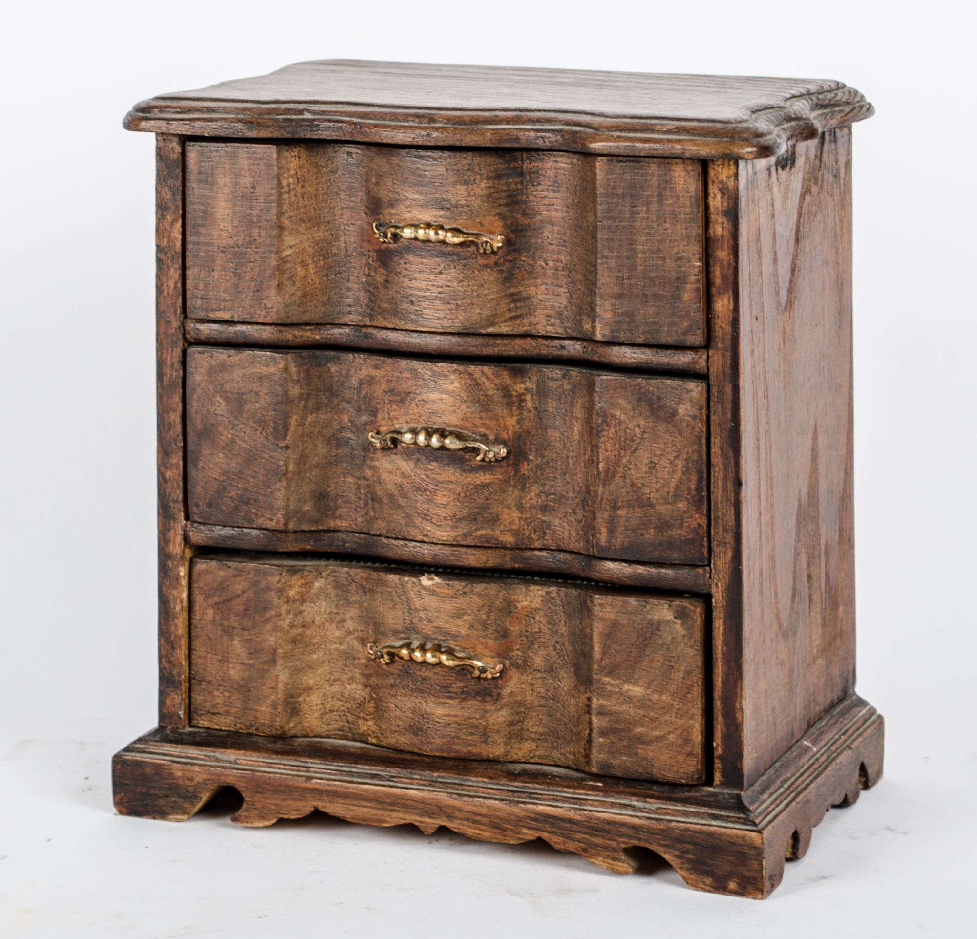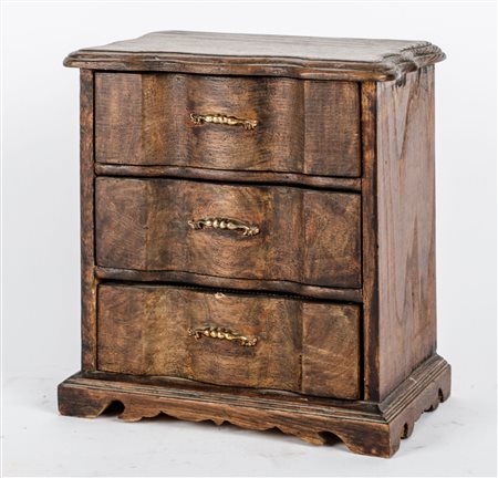 MODELLINO DI COMODINO a tre cassetti in rovere. Primi '900 Misure: cm 20,5 x 13 x h 21