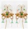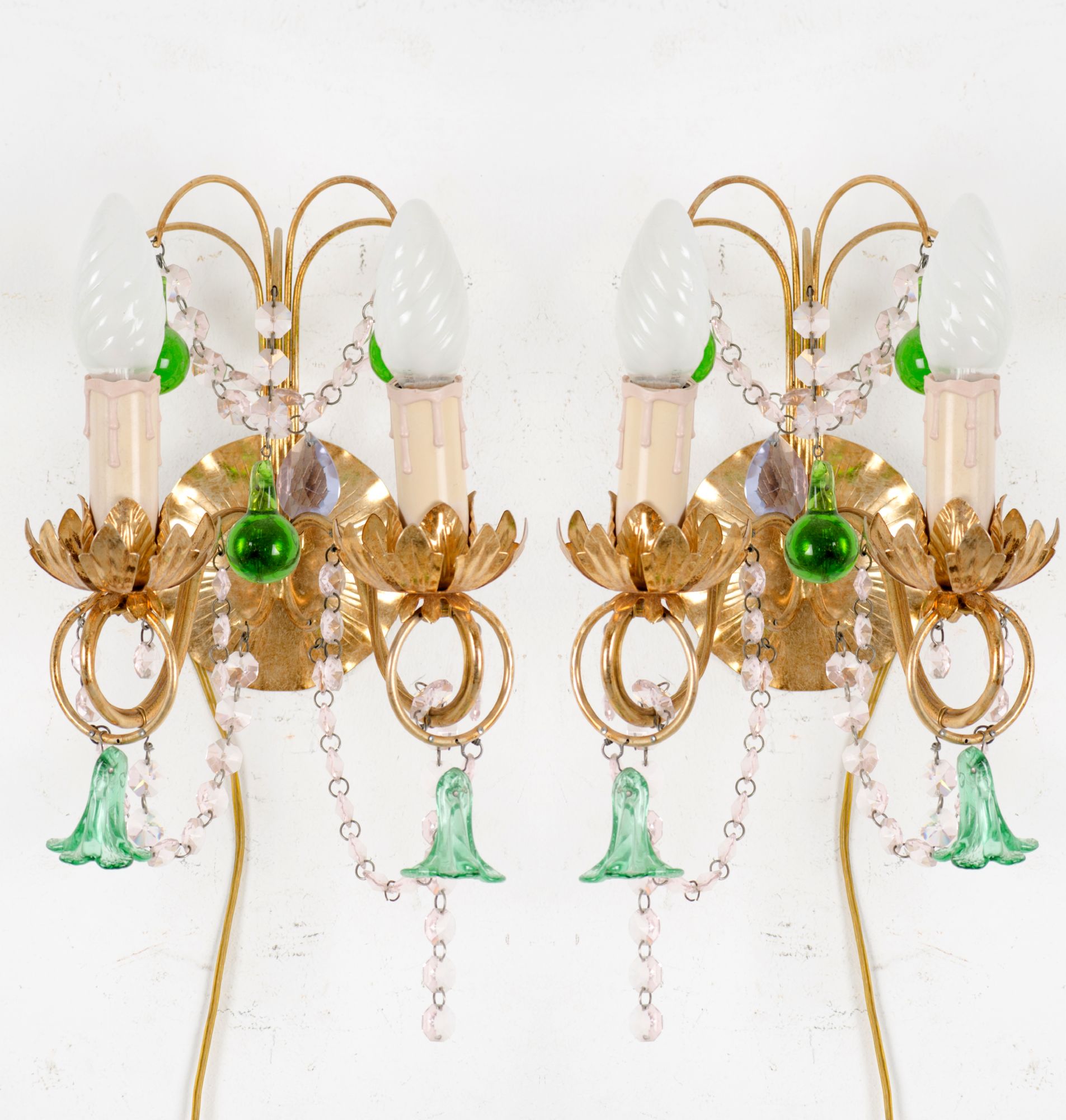 LOTTO composto da LAMPADARIO a ninfa a nove luci in ottone dorato con brindoli in vetro colorato e da due APPLIQUES a due luci. Italia XX secolo Misure: varie