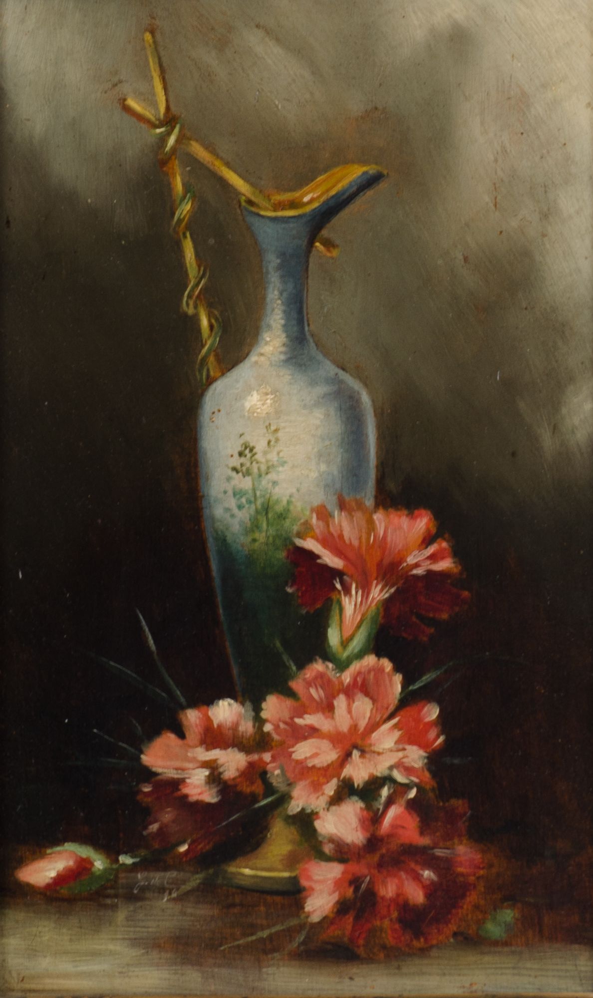 OLIO su tavoletta "anfora e fiori" entro cornice in legno ebanizzato. Primi '900 Misure: cm 32 x 20