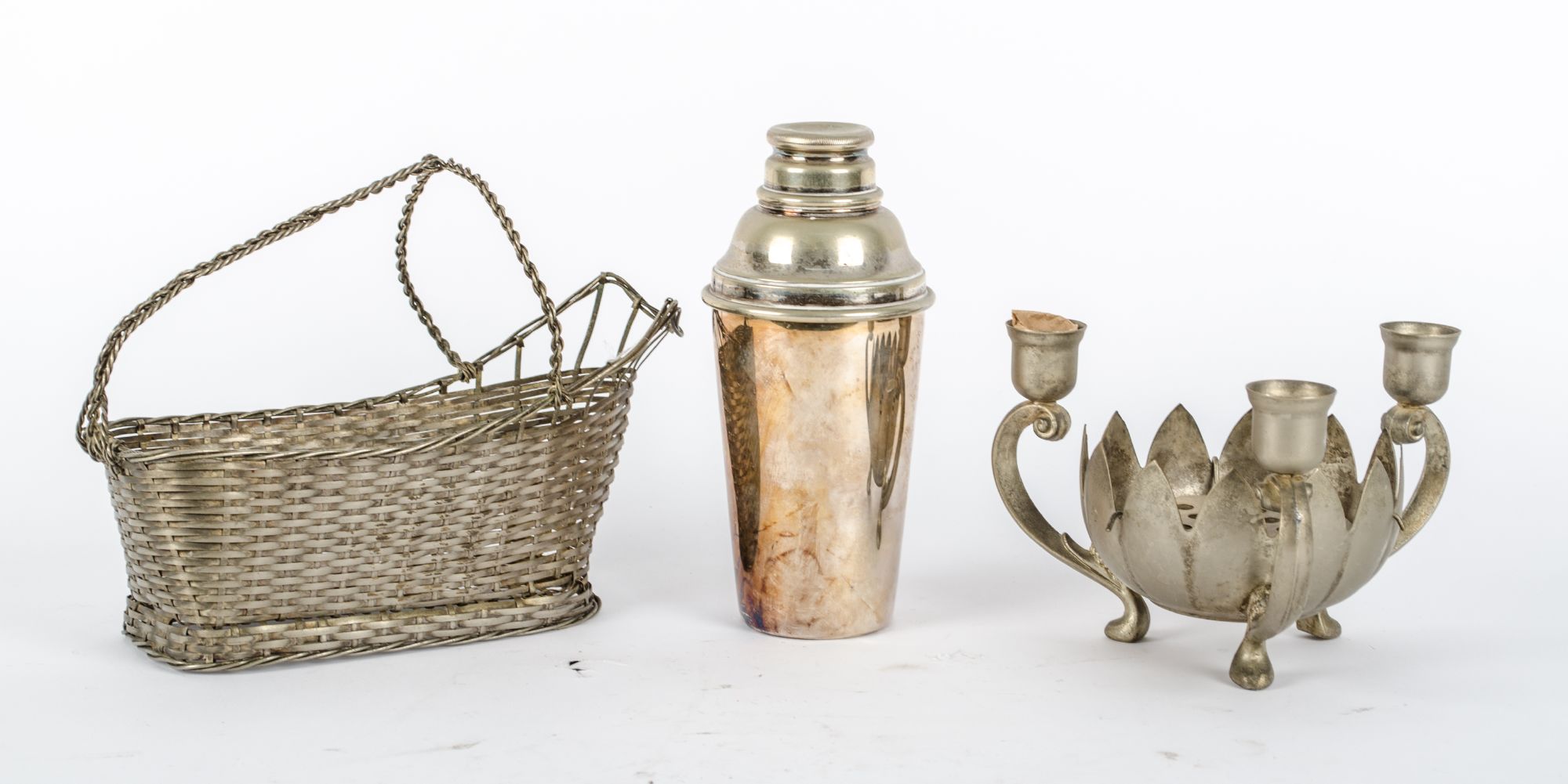 LOTTO composto da CESTINO, CANDELABRO e da SHAKER in metallo. XX secolo Misure: varie
