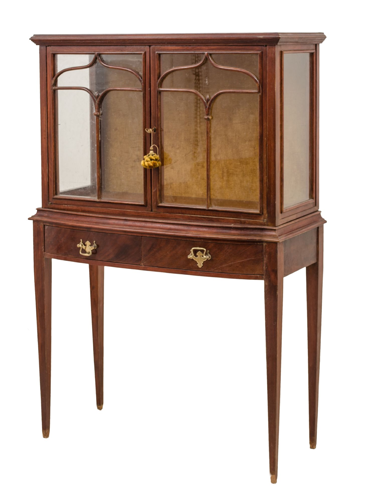 VETRINETTA a due corpi in mogano con due ante e cassetto inferiore (usure). Inghilterra XIX secolo Misure: cm 87 x 38 x h 130,5
