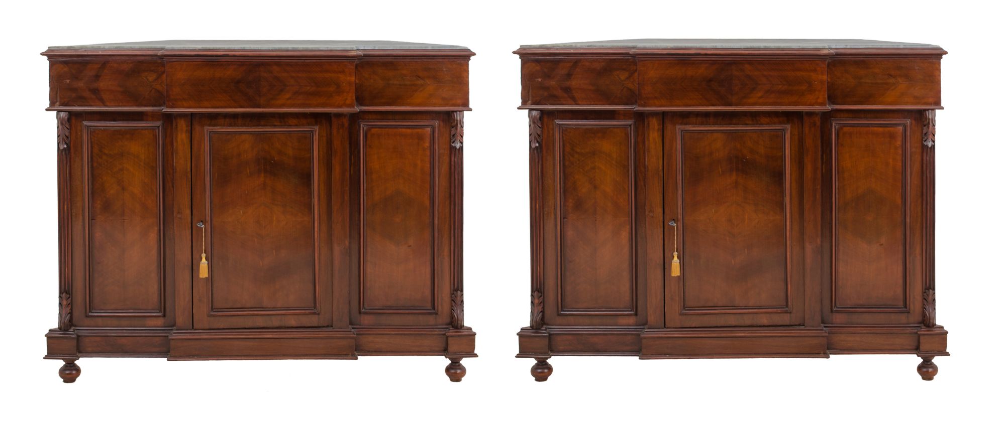 COPPIA ANGOLIERE Luigi Filippo in mogano e impiallacciato in rugatino di mogano, piano in marmo grigio. Sicilia fine '800 Misure: cm 142 x 38 x h 113