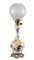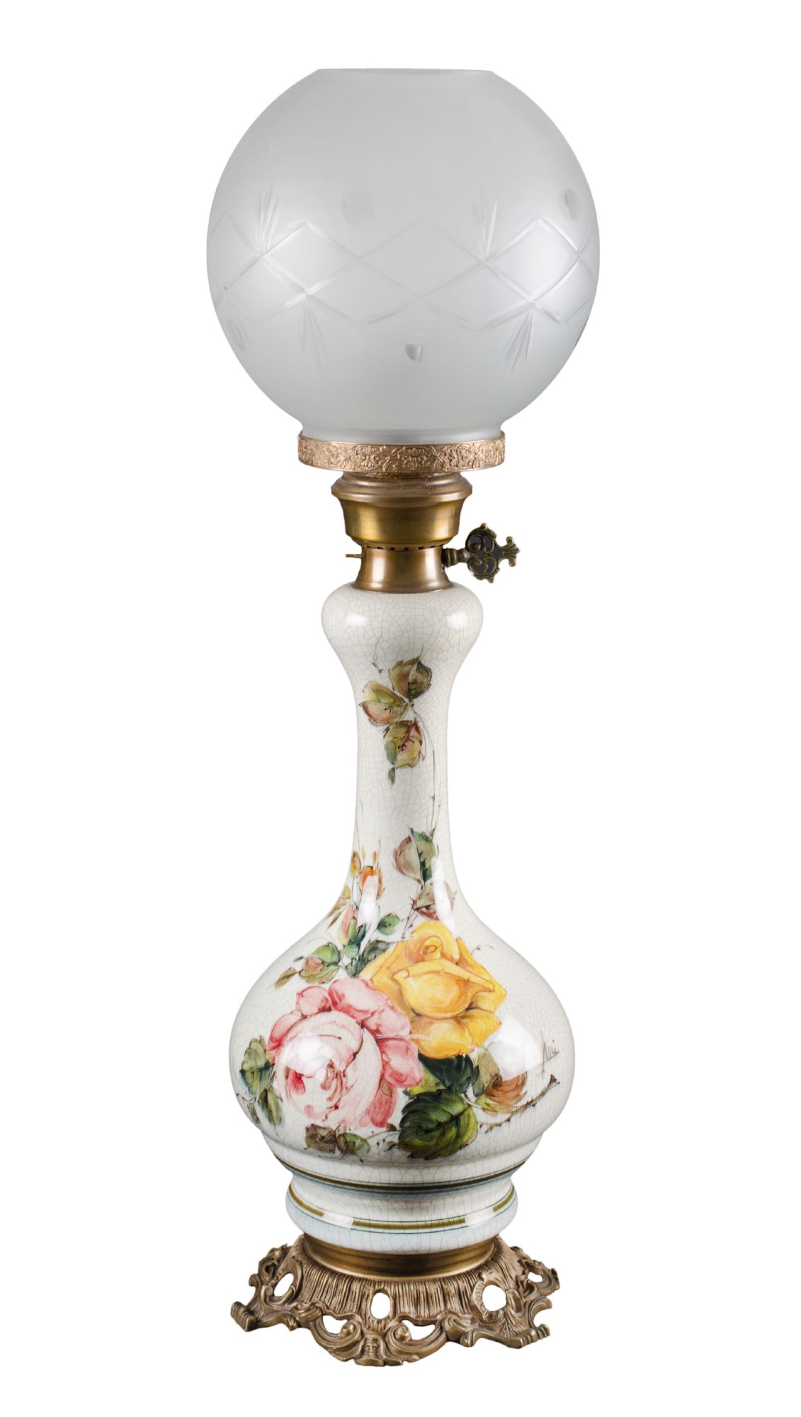 LUME in ceramica dipinta a motivo floreale con base e collo in bronzo, boccia in vetro inciso. Meta' '900 Misure: h cm 66
