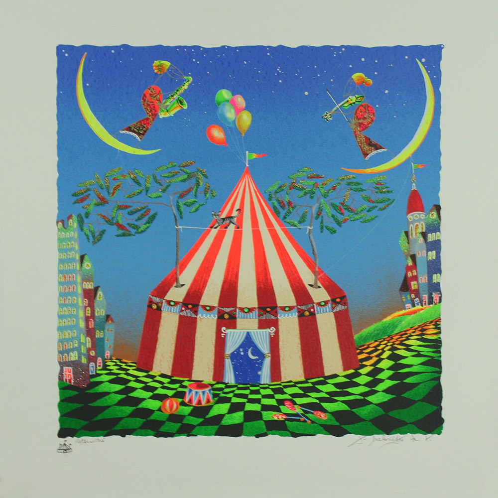 Meloniski serigrafia retouchèe "Circo magico", cm 70x70 Opera firmata in b a dx Ritoccata a mano