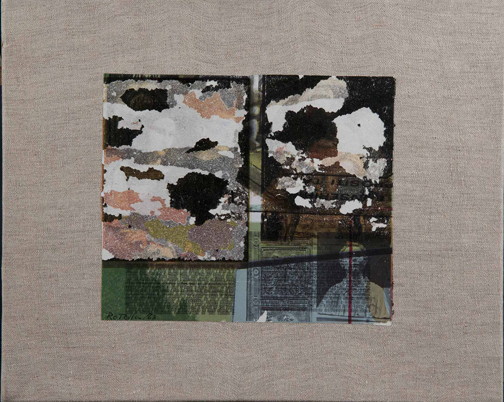 Mimmo Rotella manifesto strappato ed incollato su tela, 1963 "Italica", cm 33x41 Autentica dell'artista (in attesa dell'autentica della Fondazione) F.to in b a sx 1963 Dedica al retro M.me J.D.