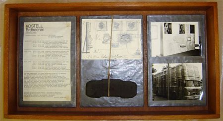 WOLF VOSTELL (Leverkusen 1932) Erdbeeren 1974 piombo, spago, foto, disegno e collage su tavola. cm 38 x 72 (41 x 75 con cornice) autenticità confermata dal museo Vostell di Malapartida (Spagna)