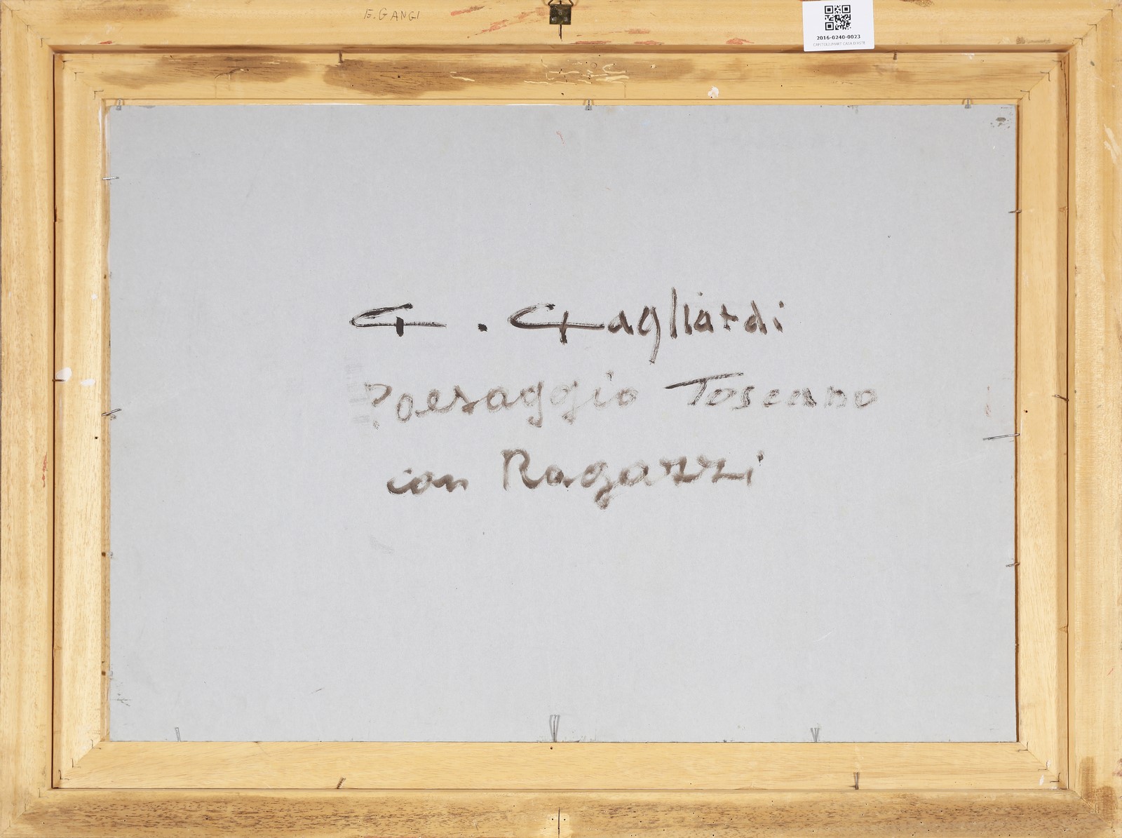 GAGLIARDI GIUSEPPE (n. 1896) Paesaggio toscano con ragazzi. Olio su cartone. Cm 70,00 x 50,00. Firma in basso a sinistra. Al retro firma e titolo. Cornice presente