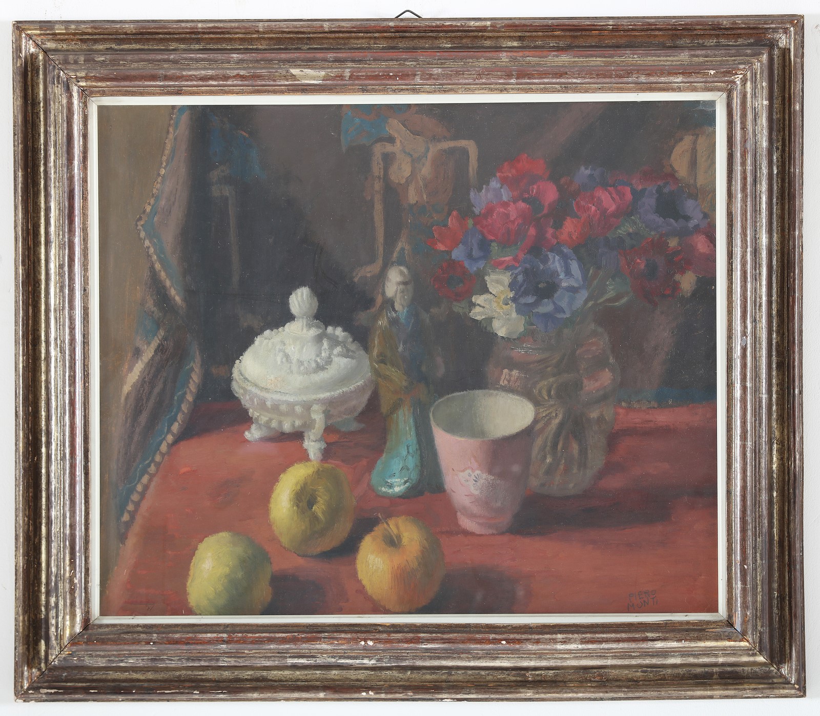 MONTI PIERO (1910 - 1944) Natura morta con mele. Olio su tavola. Cm 59,00 x 49,00. Firma in basso a destra. Al retro presente un altro dipinto raffigurante una giovane ragazza. Cornice presente