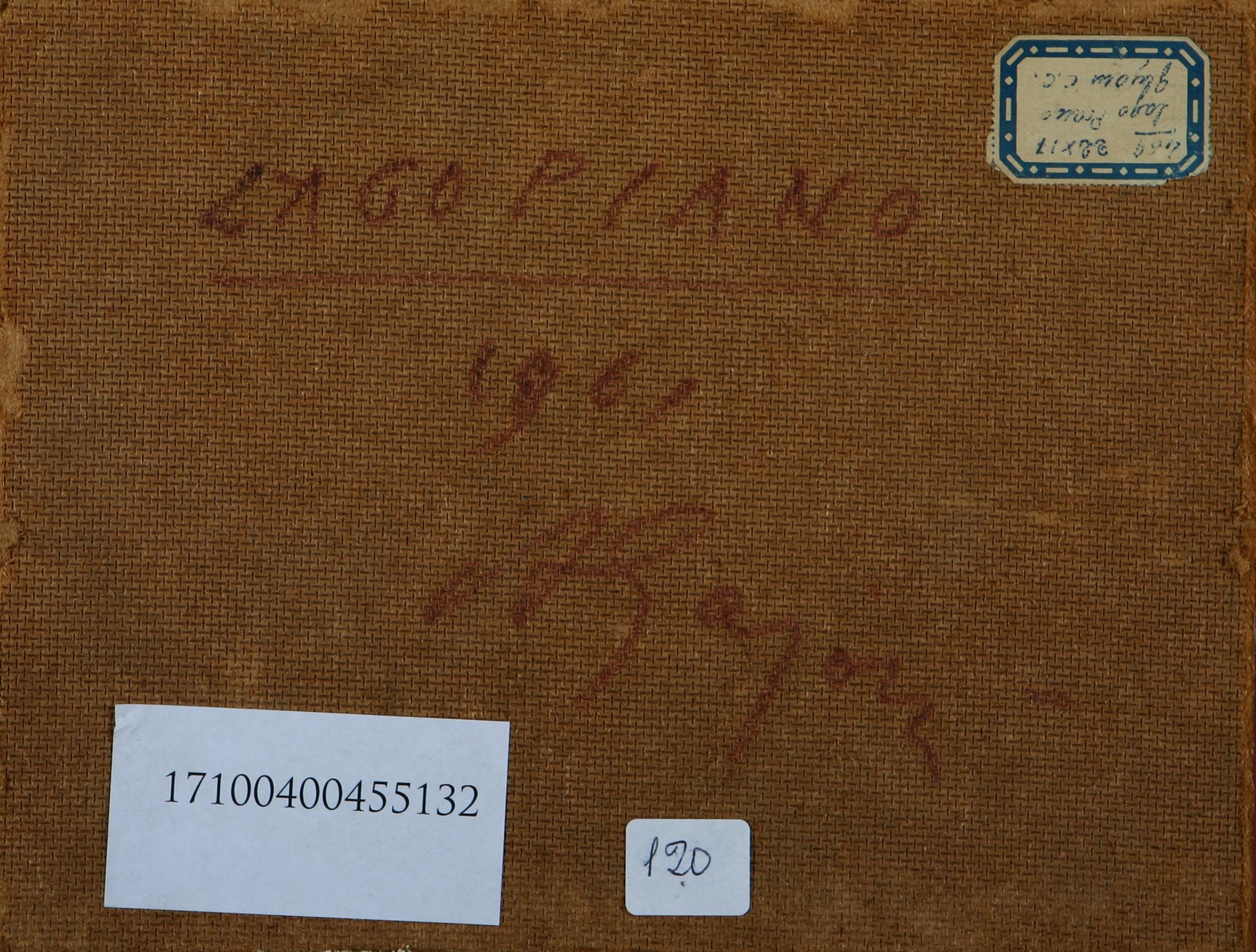 GAJONI ADRIANO (1913 - 1965) Lago piano. 1961. Olio su tavoletta. Cm 22,50 x 17,00. Firma in basso a destra. Al retro data, firma e titolo. Cornice presente