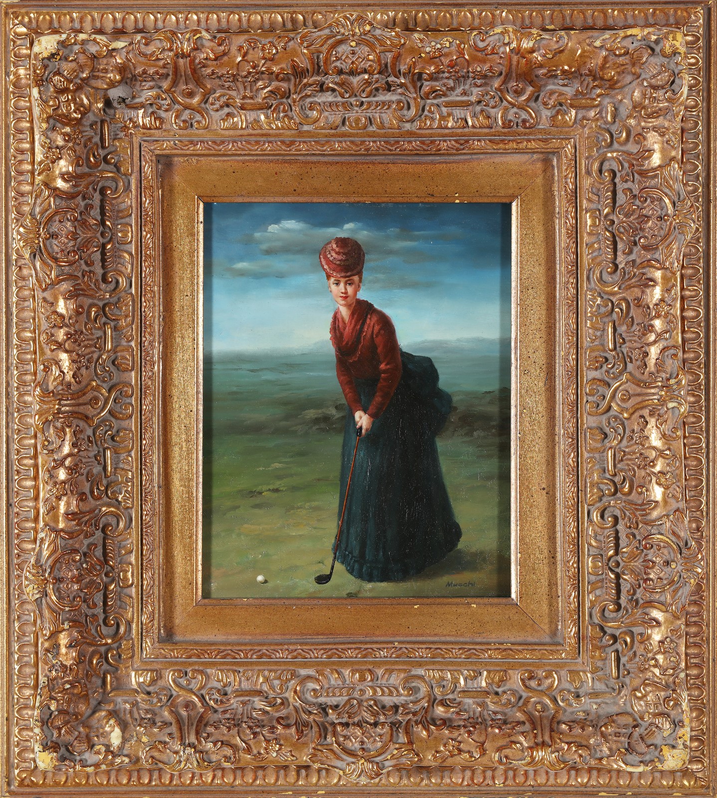 MUCCHI GABRIELE (1899 - 2002) Giocatrice di golf. . Olio su tavola. Cm 20,00 x 25,00. Firma in basso a destra. . Cornice presente