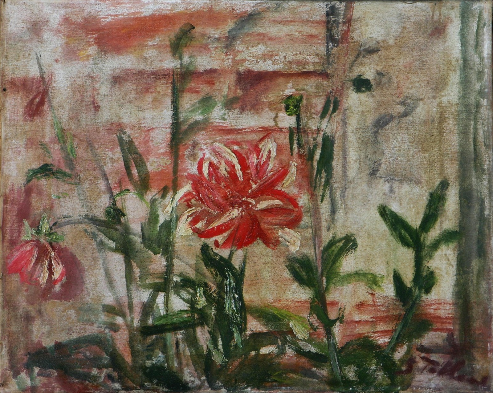 TALLONE GUIDO (1894 - 1967) Dalie. 1955. Olio su tela. Cm 55,00 x 44,00. Firma in basso a destra. Al retro cartiglio della galleria d'arte Sianesi di Milano “mostra personale Guido Tallone, Aprile 55". Al retro autentica dell'artista. Autentica a cura dell'Archivio Guido Tallone, Milano riportante il relativo numero d'inventario. Cornice presente