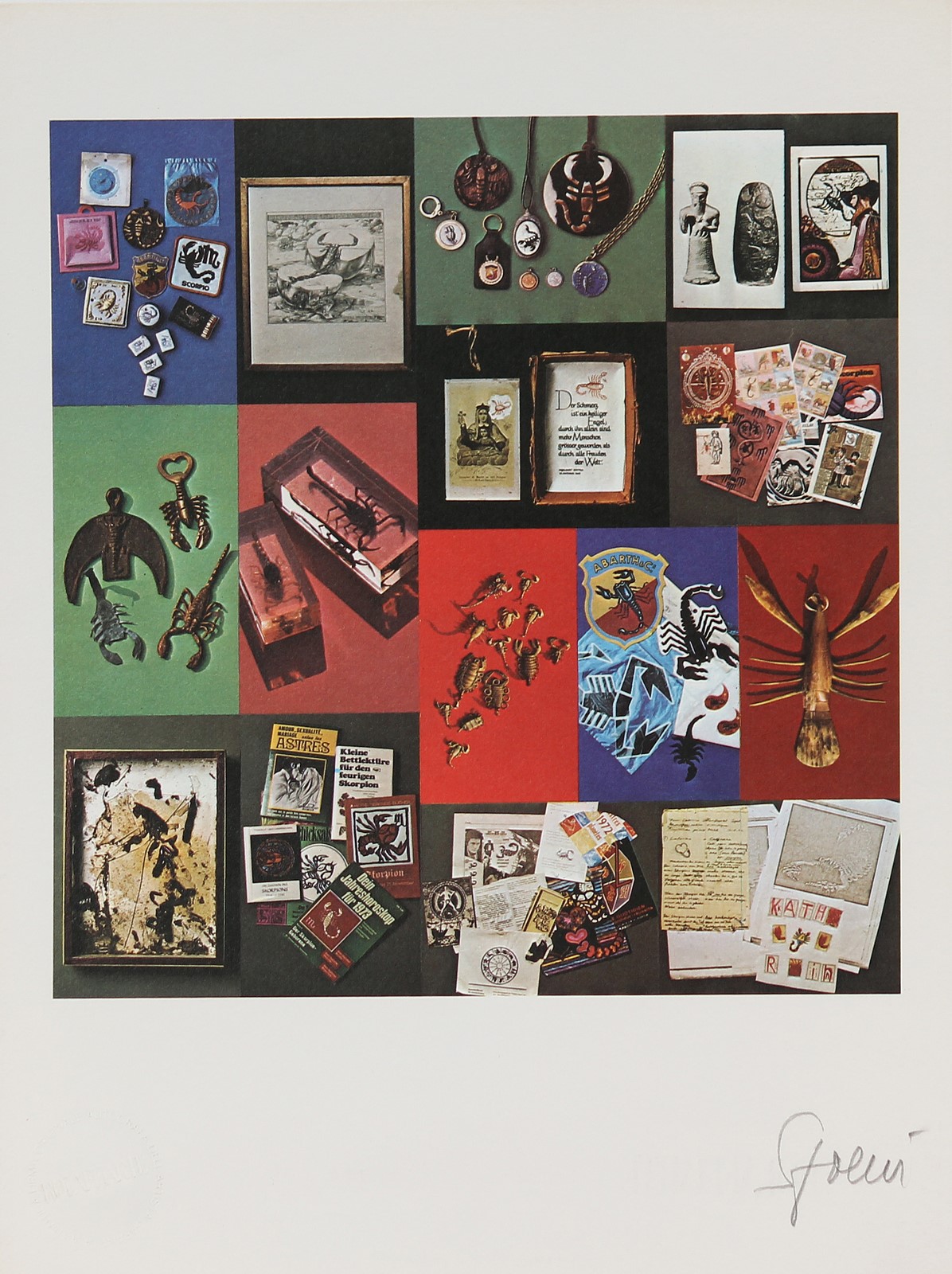 SPOERRI DANIEL (n. 1930) Senza titolo. . Fotolitografia. Cm 21,00 x 28,00. Esemplare 771. Riproduzione fotolitografica dell' opera originale "Lo Scorpione" eseguita per la serie "Lo zodiaco" di Bolaffi arte. Firma originale in basso a matita. Ed, BolaffiArte. Anni '70. Timbro a secco BolaffiArte in basso a sinistra. Tiratura al retro.