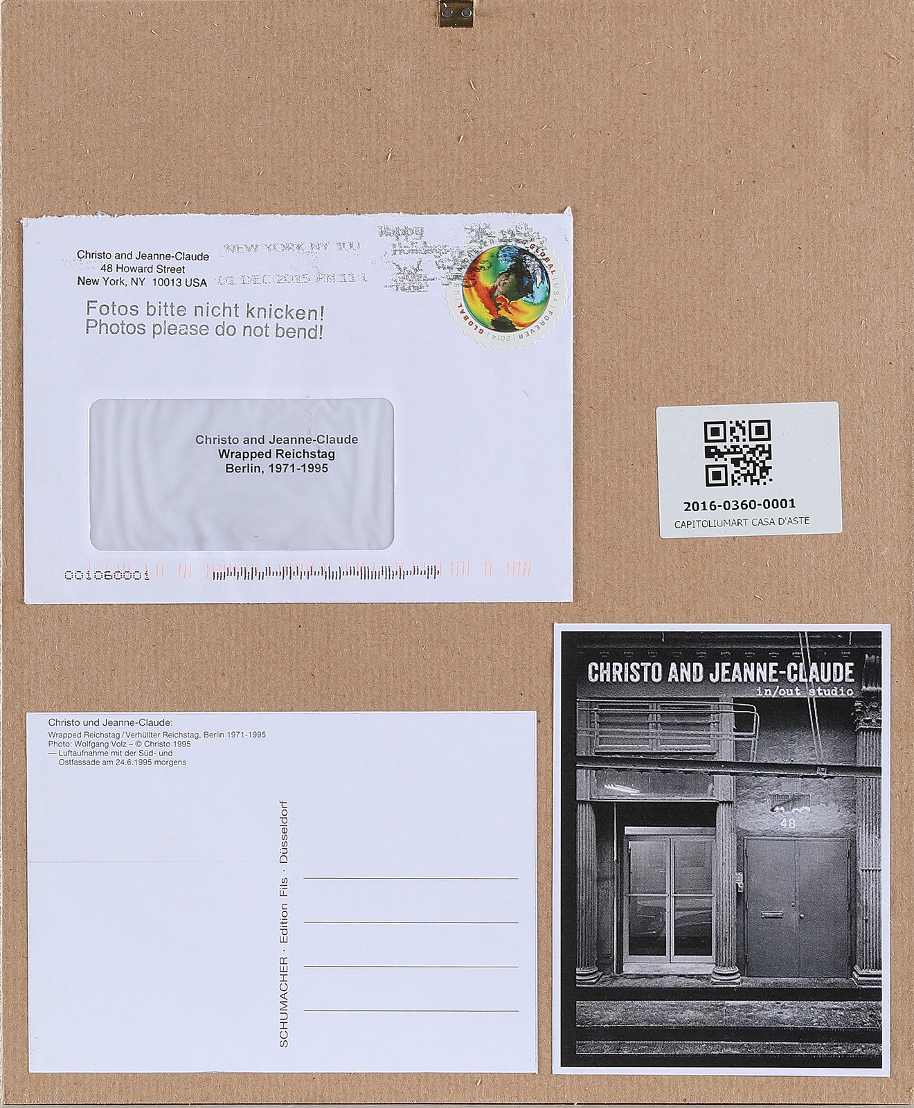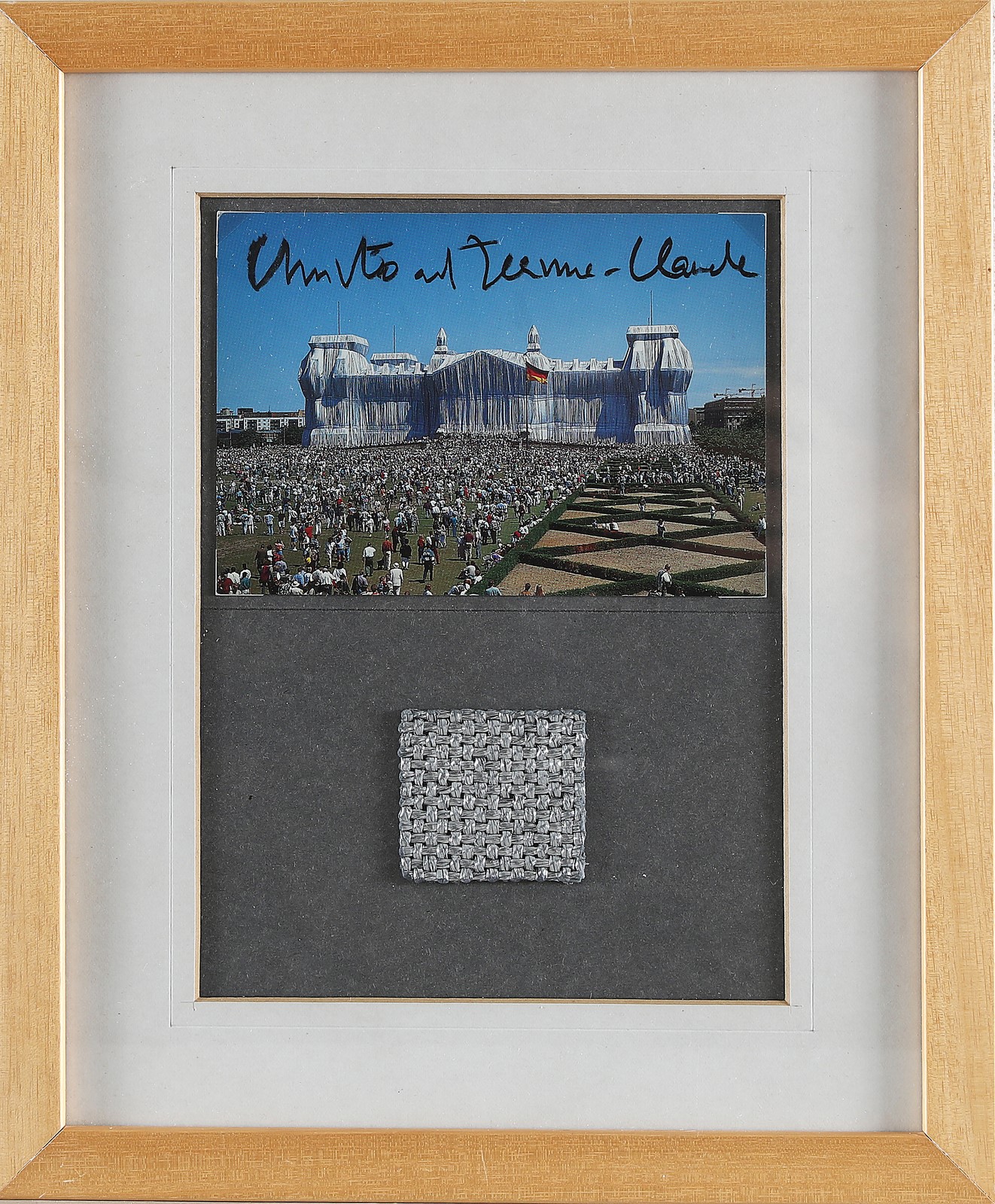 CHRISTO' (n. 1935) & JEANNE-CLAUDE (1935 - 2009) Wrapped Reichstag. Berlino. Cartolina e tessuto. Cm 15,50 x 21,50. 1971 - 1995. Presente pezzo di tessuto. Firmato in alto. Cornice presente